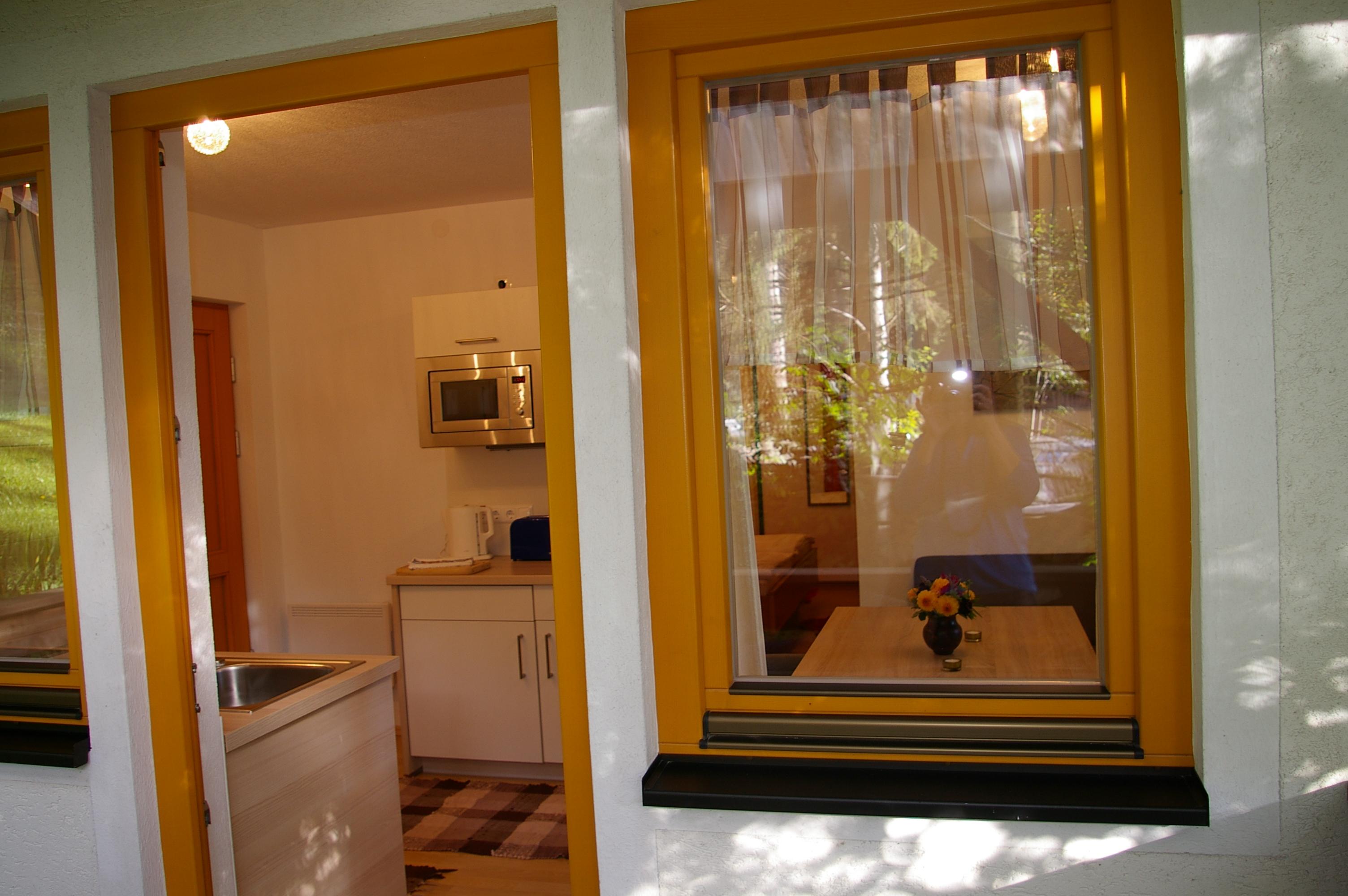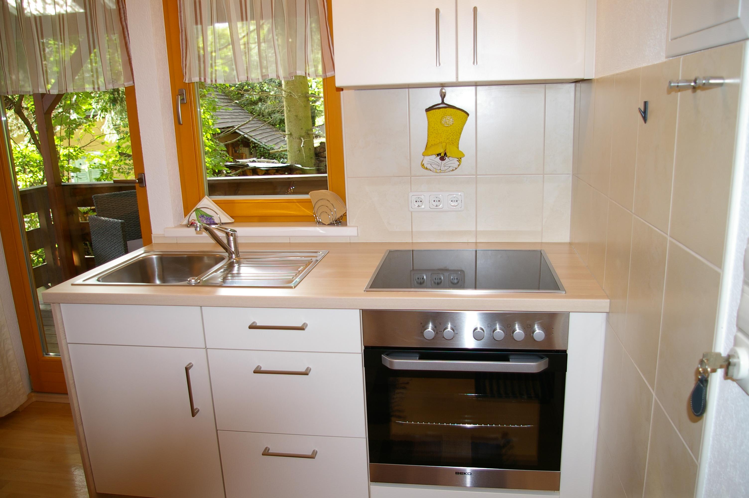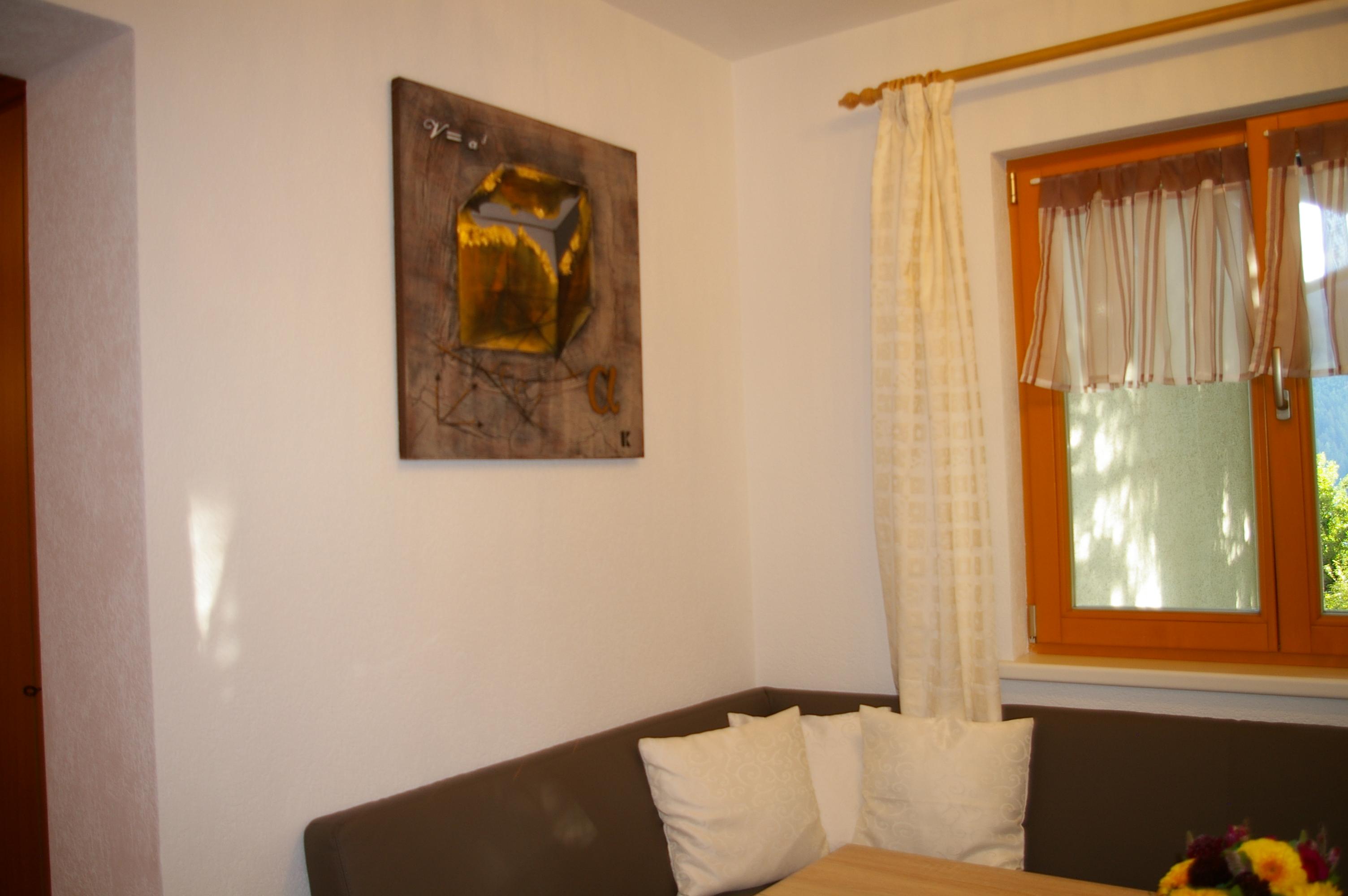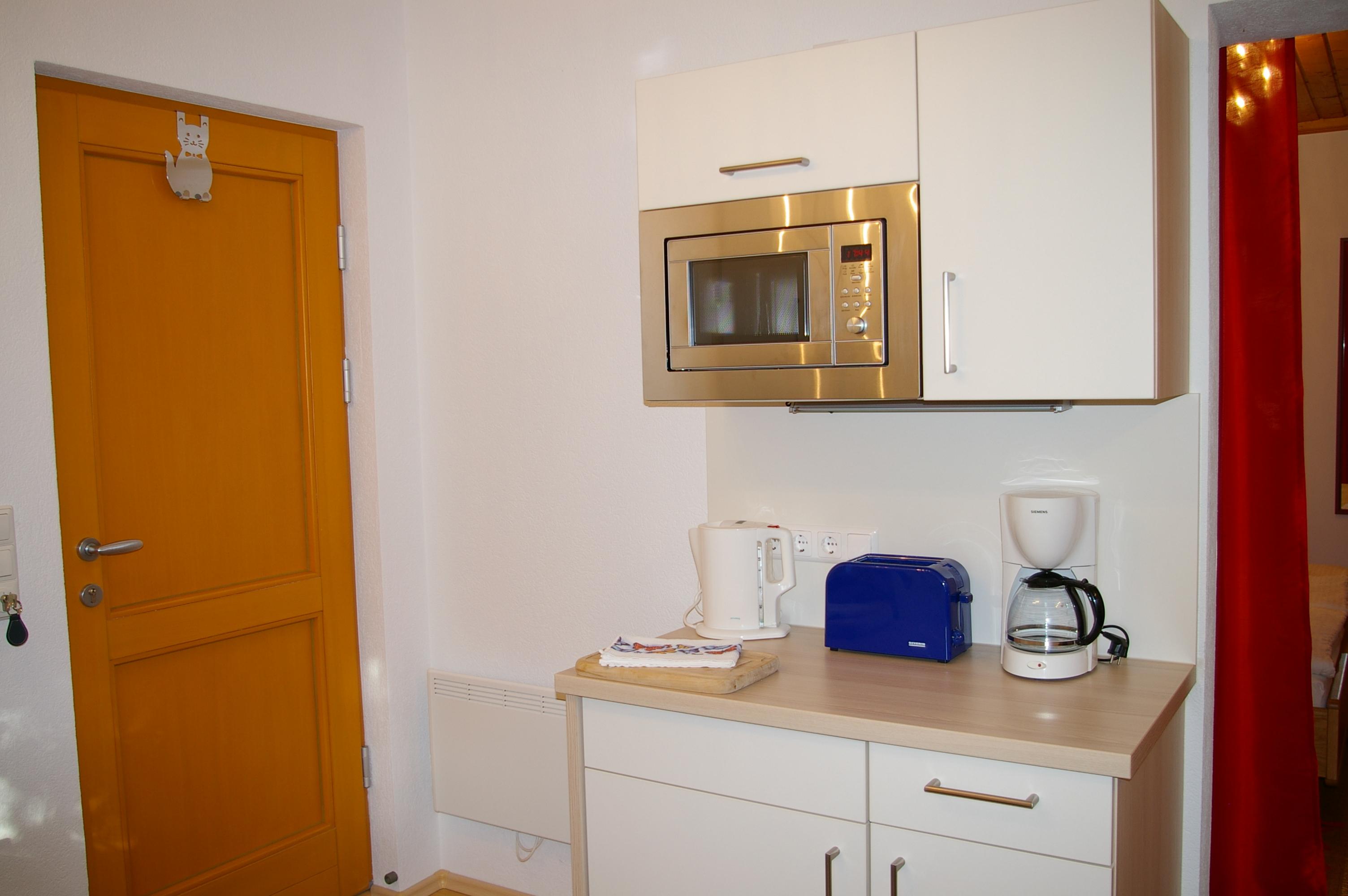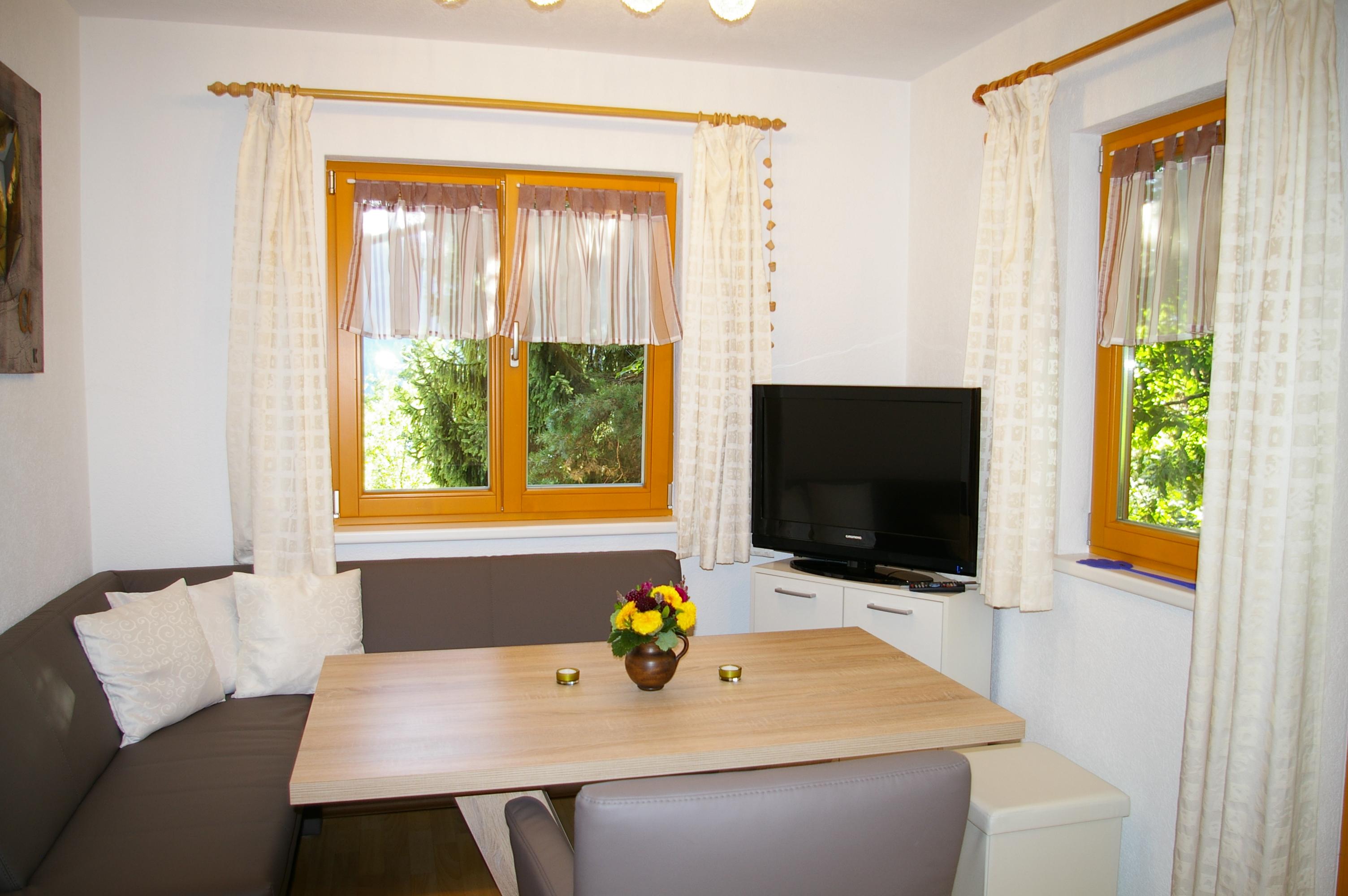 Die Wohnküche verfügt über eine gemütliche Essecke mit direktem Blick auf den Fernseher mit Sat - TV. Der Küchenblock besteht aus einer Spüle, Herd mit Backrohr, Kühlschrank mit Gefrierfach, Mikrowelle und ausreichend Staumöglichkeit. Das Schlafzimmer ist hell und geräumig. Die Süd-Westterrasse bietet den Blick auf See und Berge. Das Appartement ist beheizbar.