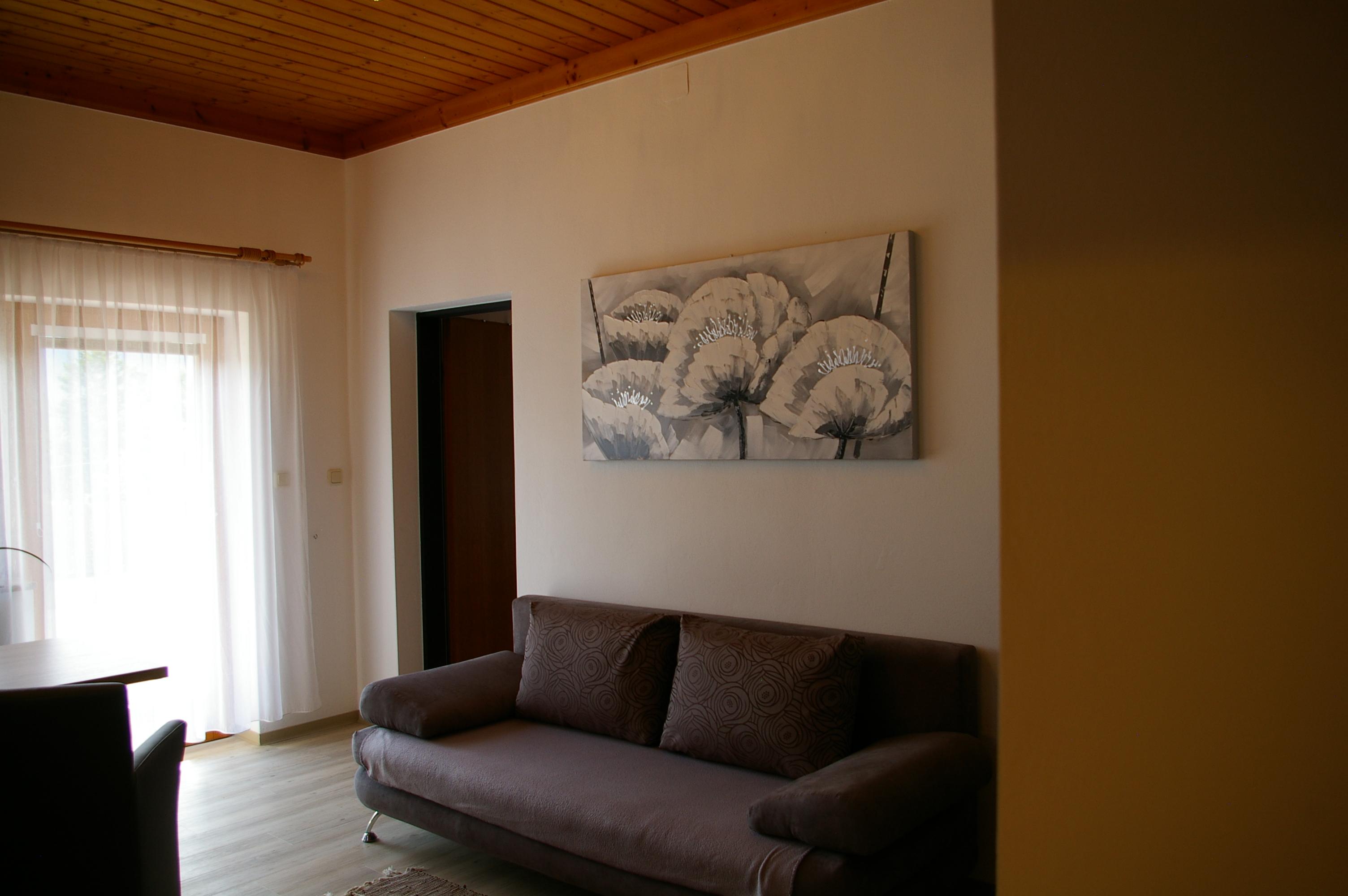 Das 38 m2 große Appartement besteht aus einer Wohnküche, einem Schlafzimmer, Dusche und WC. Die helle und geräumige Wohnküche ist mit einer gemütlichen Essecke eingerichtet und verfügt über eine Sonnenterrasse. Der Küchenblock besteht aus einem Spülbecken, einem Herd mit Backrohr, Mikrowelle sowie einem Kühlschrank mit Gefrierfach. Neben dem gemütlichen Sofa befindet sich der Fernseher mit Sat - TV und einer Leselampe. Das geräumige Schlafzimmer bietet genug Staumöglichkeit. Das ganze Appartement ist beheizbar.