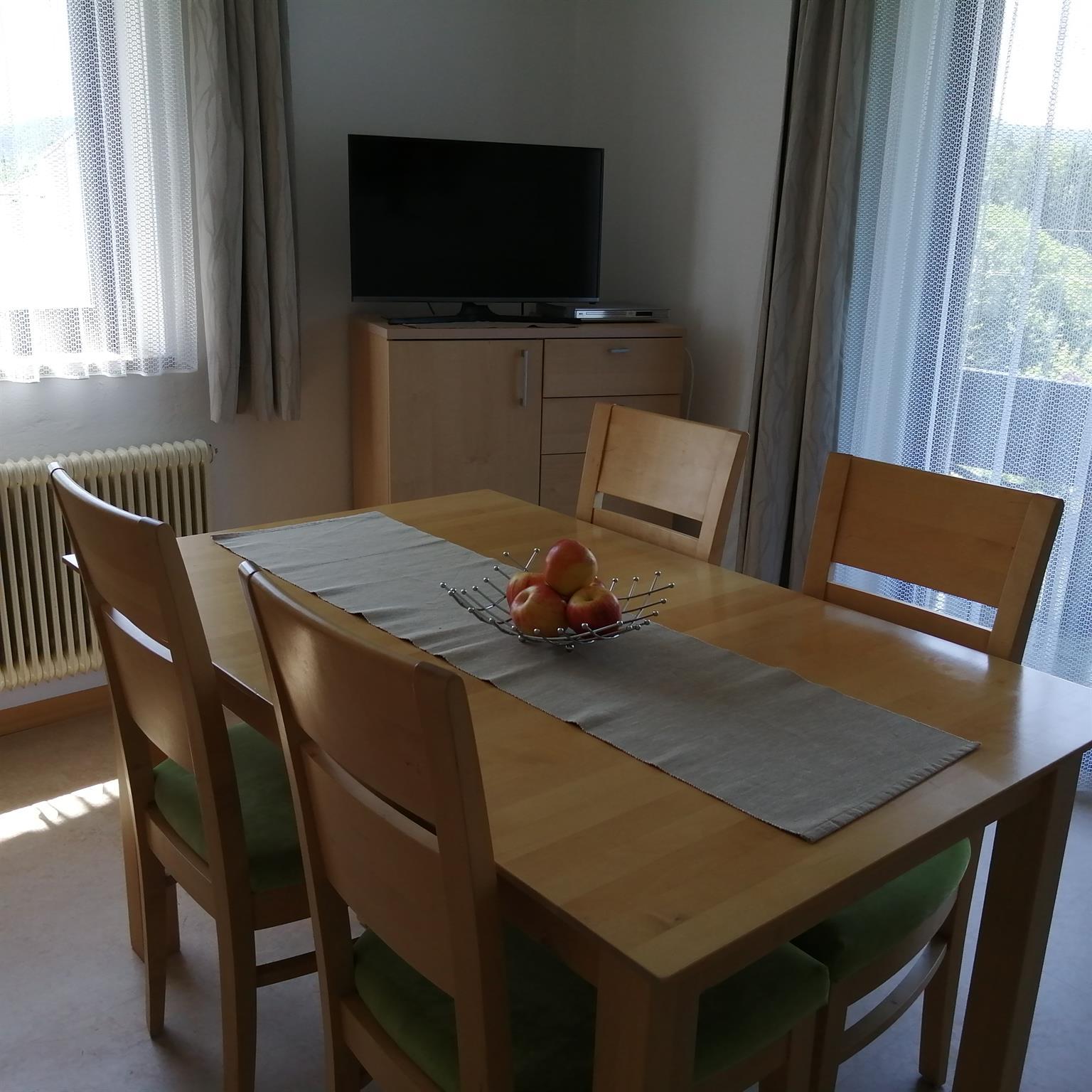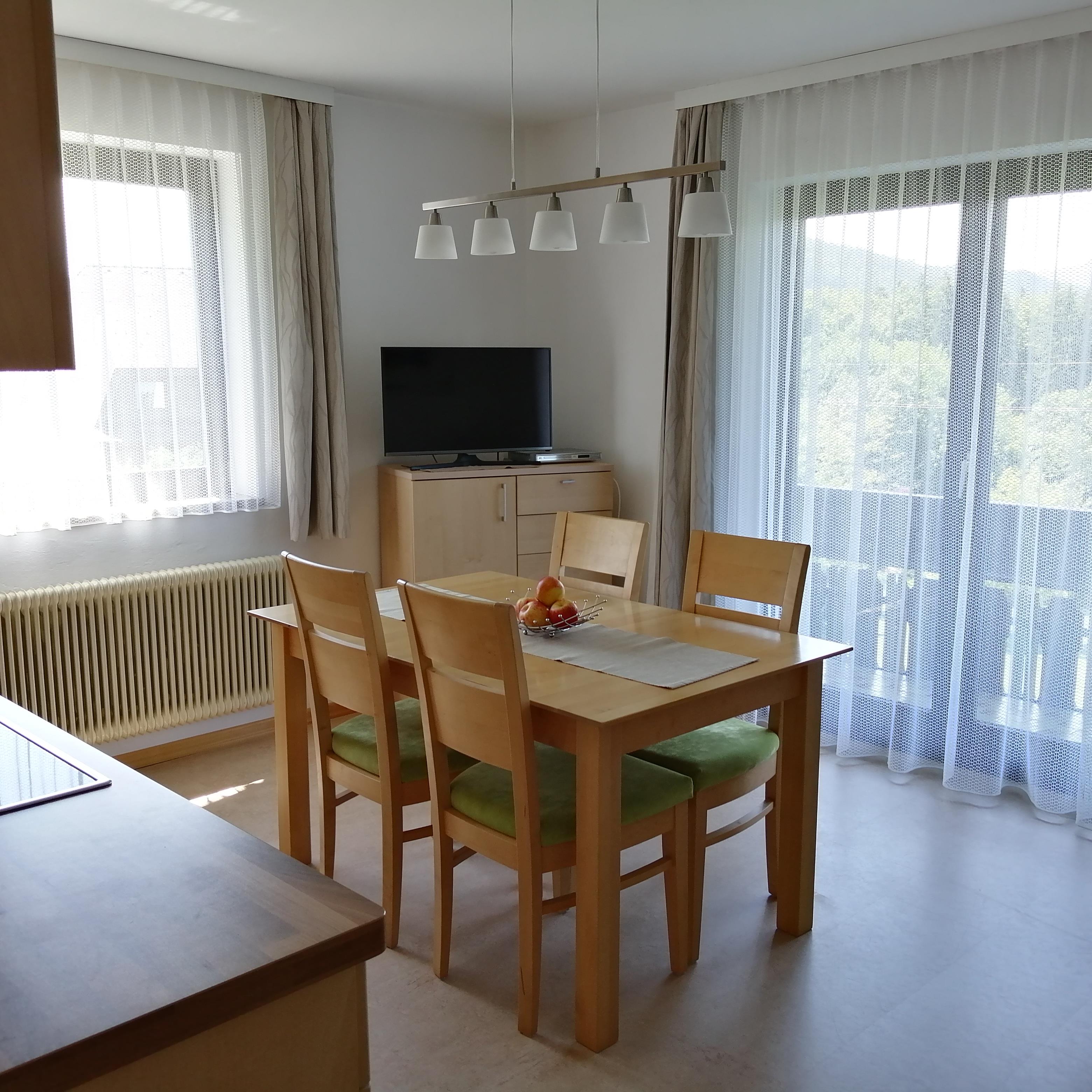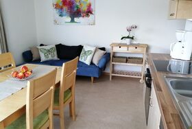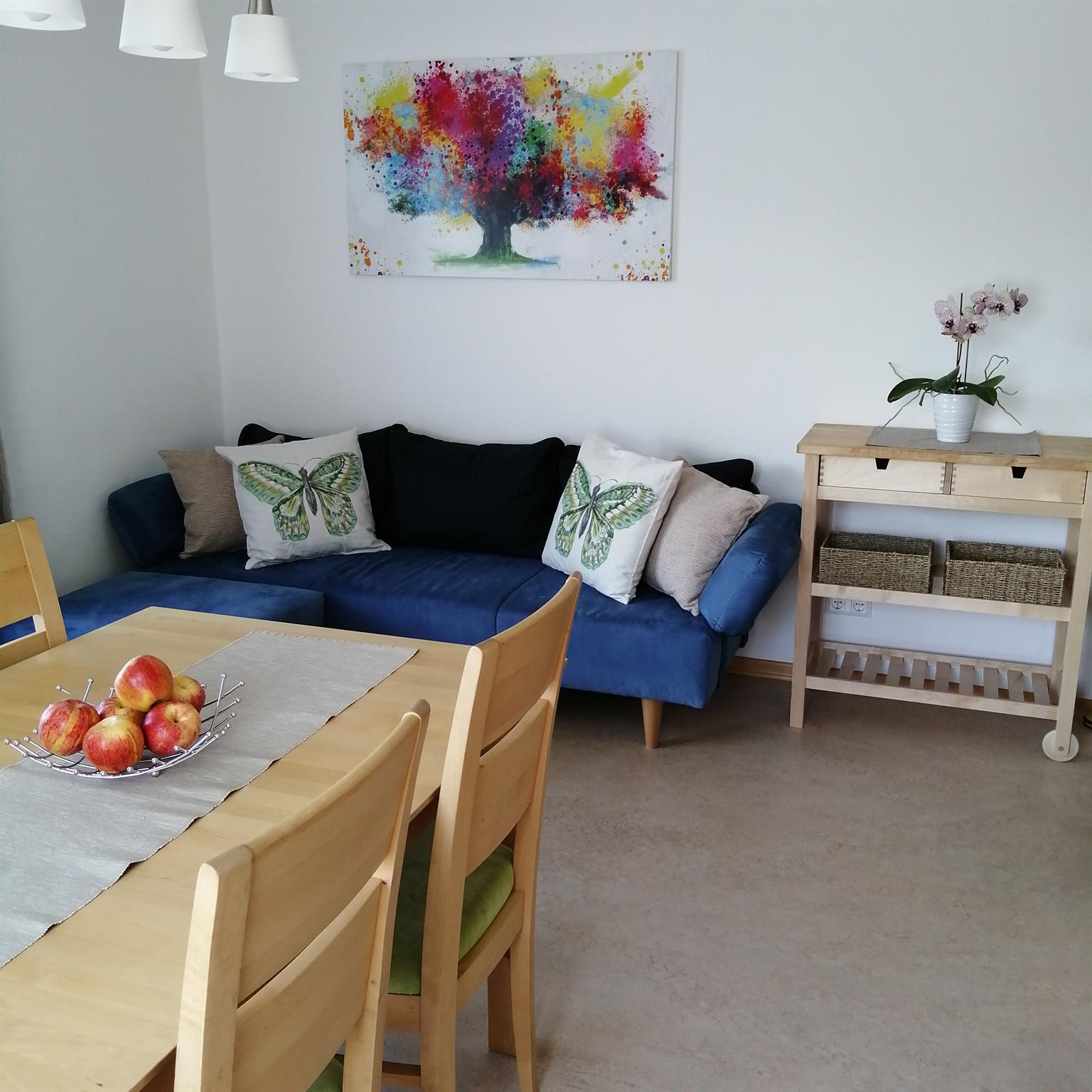 Die moderne Wohnküche inkl. Balkon ist ausgestattet mit einem Geschirrspüler, Mikrowelle, E-Herd mit Ceranfeld und Backrohr ,Toaster, Kaffeefiltermaschine, Wasserkocher, Kühlschrank mit Gefrierfach, Backrohr, ein Tisch für 4-6 Personen sowie ausreichend Geschirr, Besteck und Geschirrtücher. Ein Sofa, Sat-TV mit DVD Player rundet das Angebot ab.