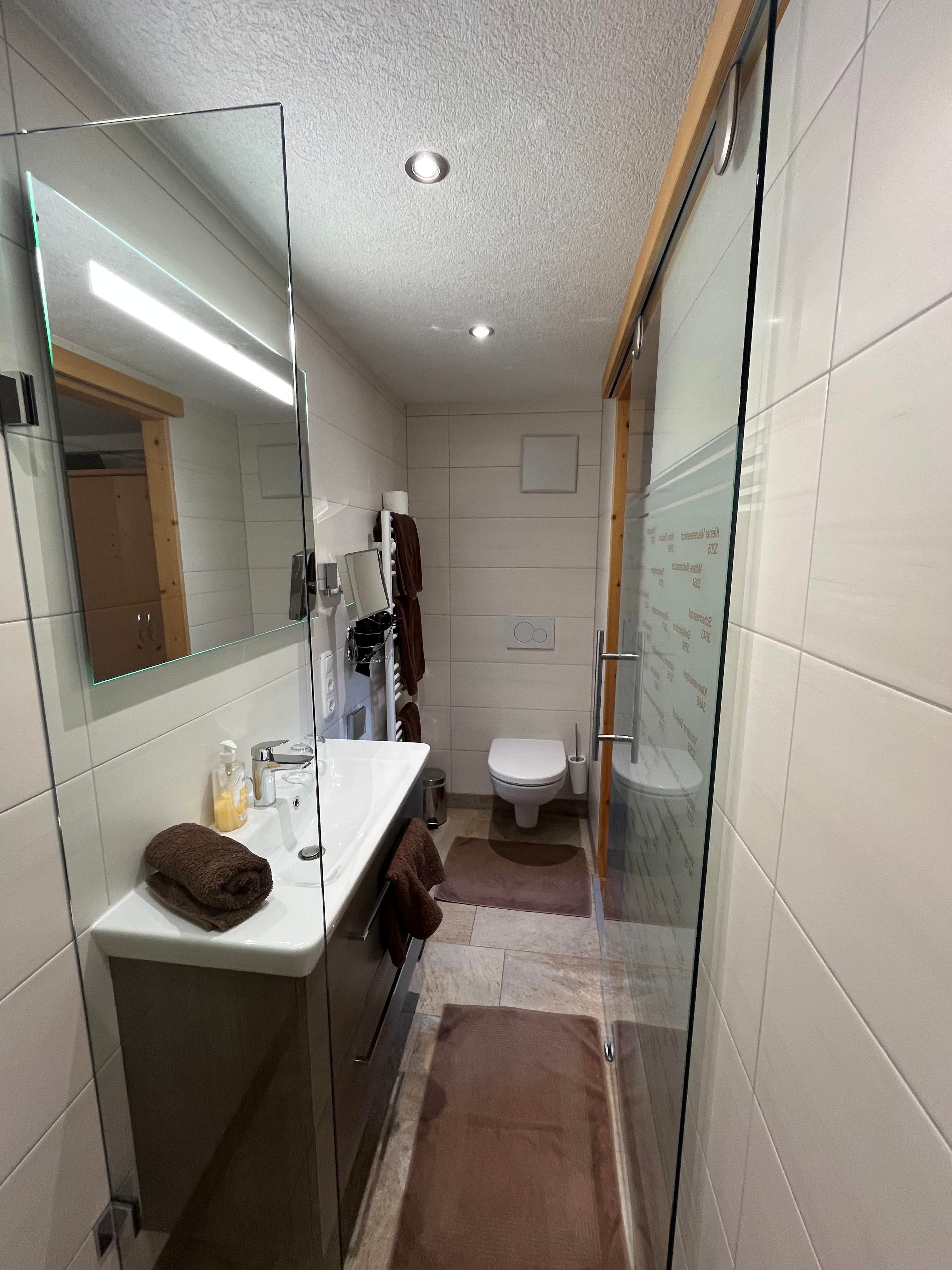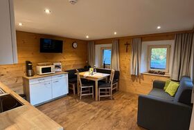 Von dort gelangt man ins Badezimmer mit DU/WC. Mit komplett ausgestatter Wohnküche mit einer ausziehbaren Couch für 2 weitere Personen.