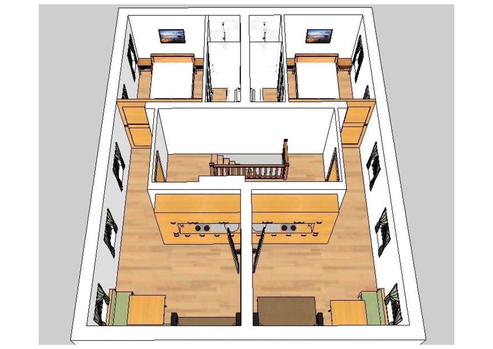 1 Schlafzimmer mit Doppelbett mit Blickrichtung nach Osten. Von dort gelangt man ins Badezimmer mit DU/WC. Mit komplett ausgestatter Wohnküche mit einer ausziehbaren Couch für 2 weitere Personen.