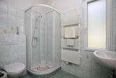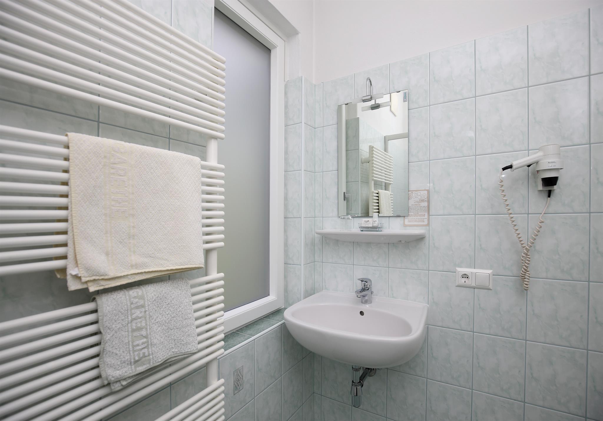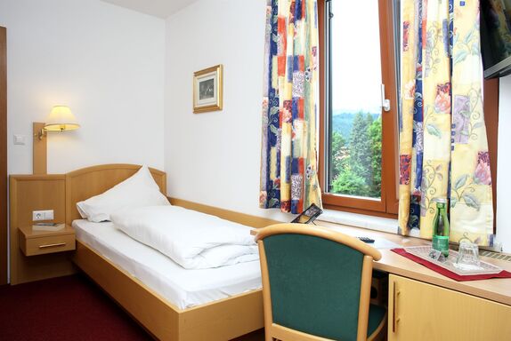 Einbettzimmer mit Dusche/WC, Föhn, Sat-TV, Telefon gegen Gebühr, WLAN frei, Kühlschrank, Tisch mit einem Stuhl