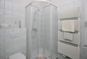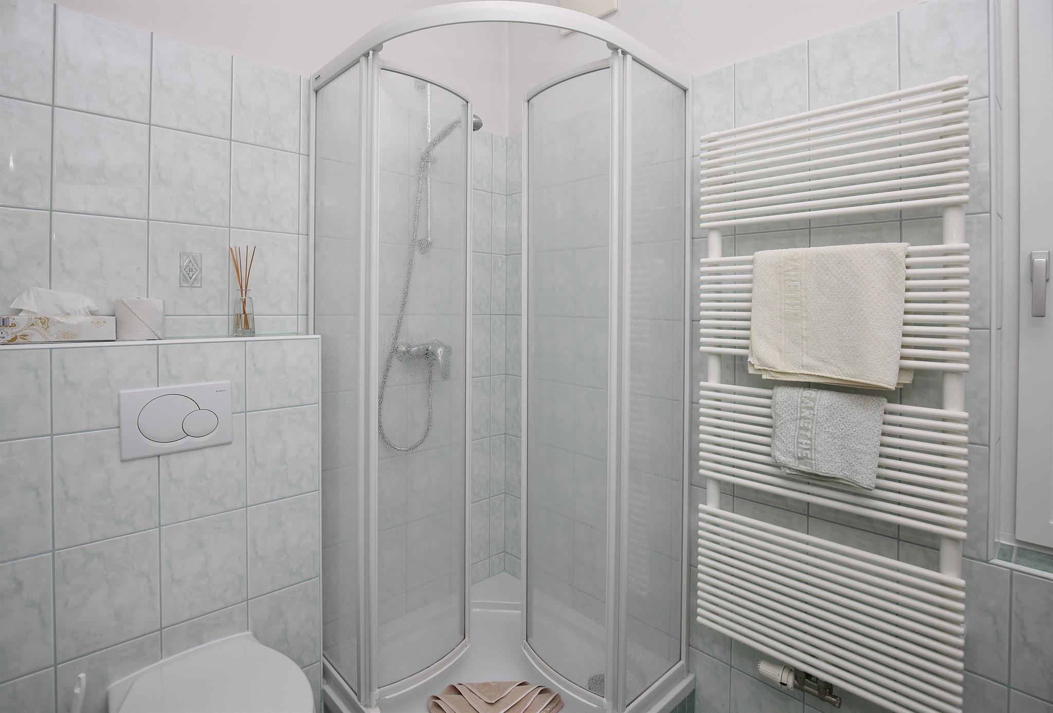 Doppelzimmer mit Dusche/WC, Föhn, gartenseitig, zum Teil gemütliche Dachschräge, 2. Stock, Sat-TV, Telefon gegen Gebühr, WLAN frei, Kühlschrank, Tisch mit 2 Stühlen, Schreibtisch, gräumiges Bad mit Dusche, Fön