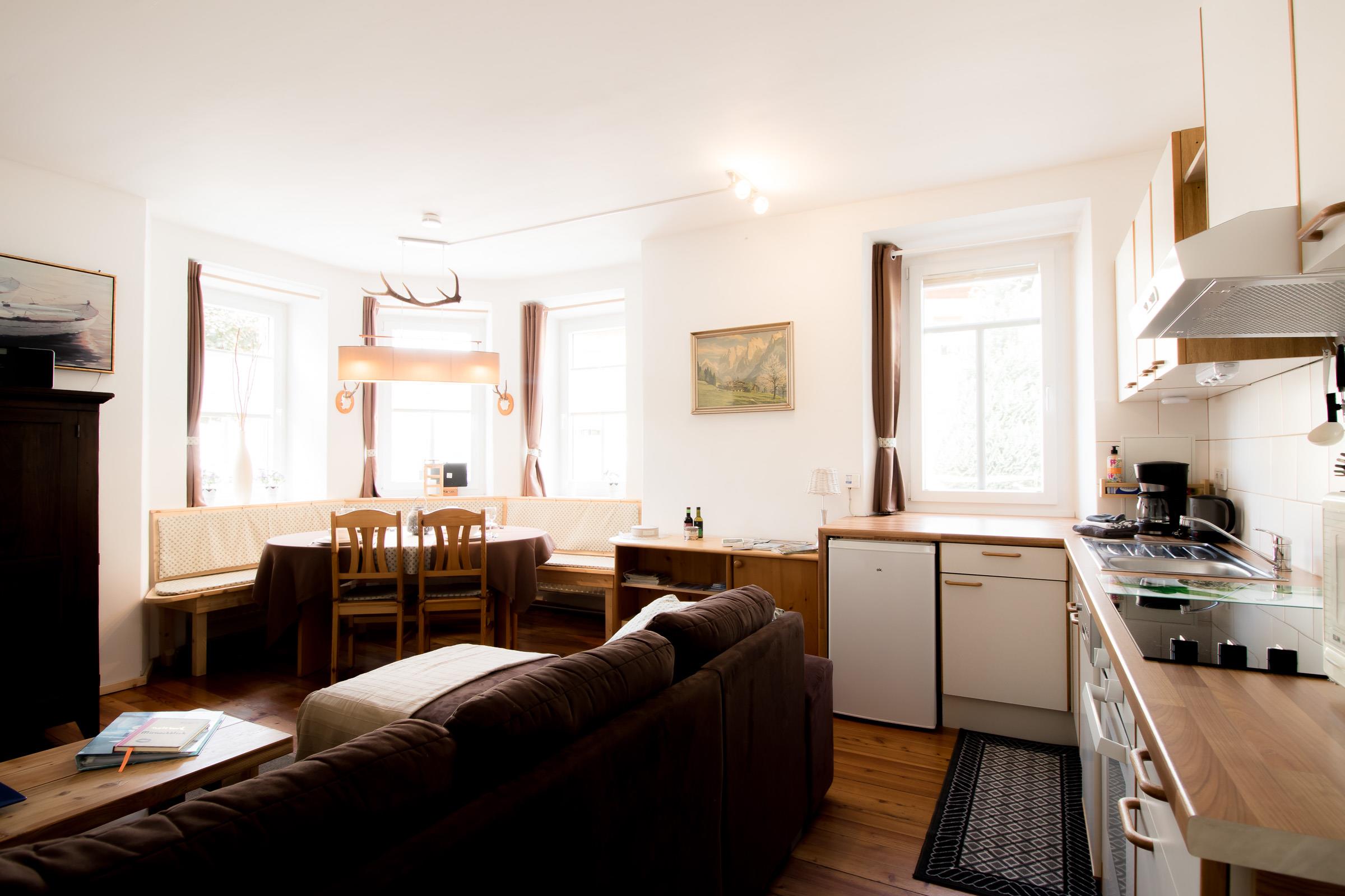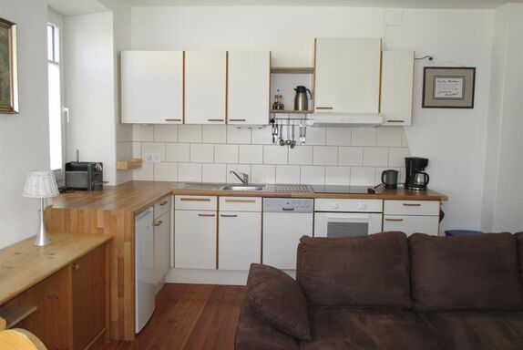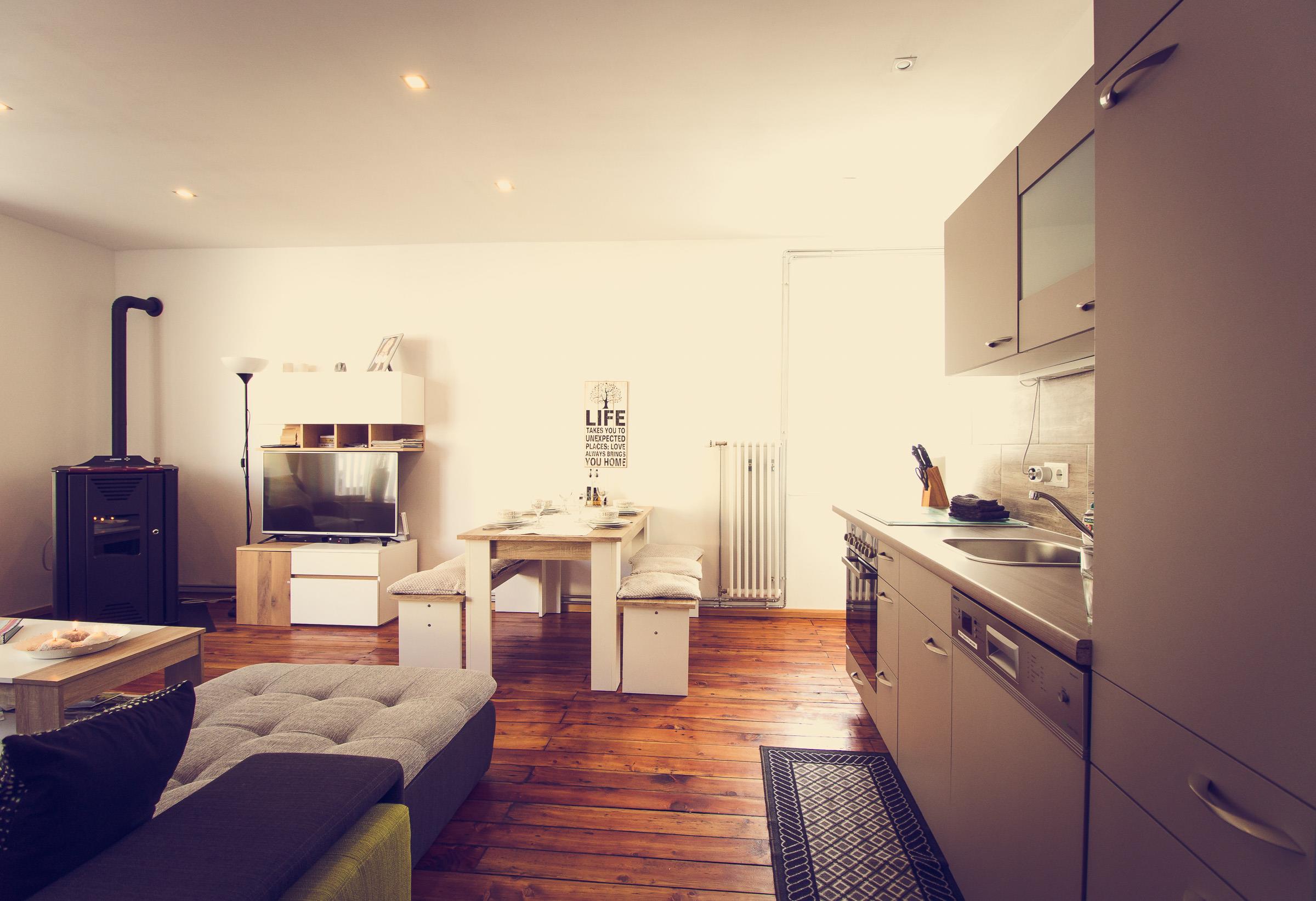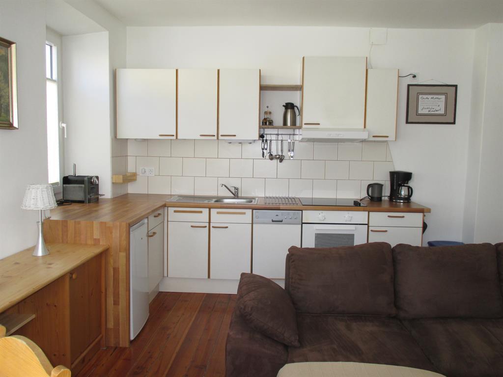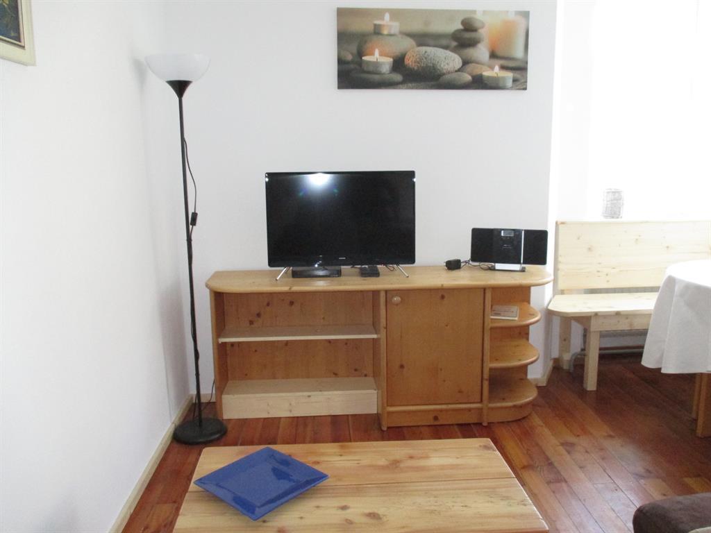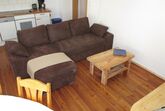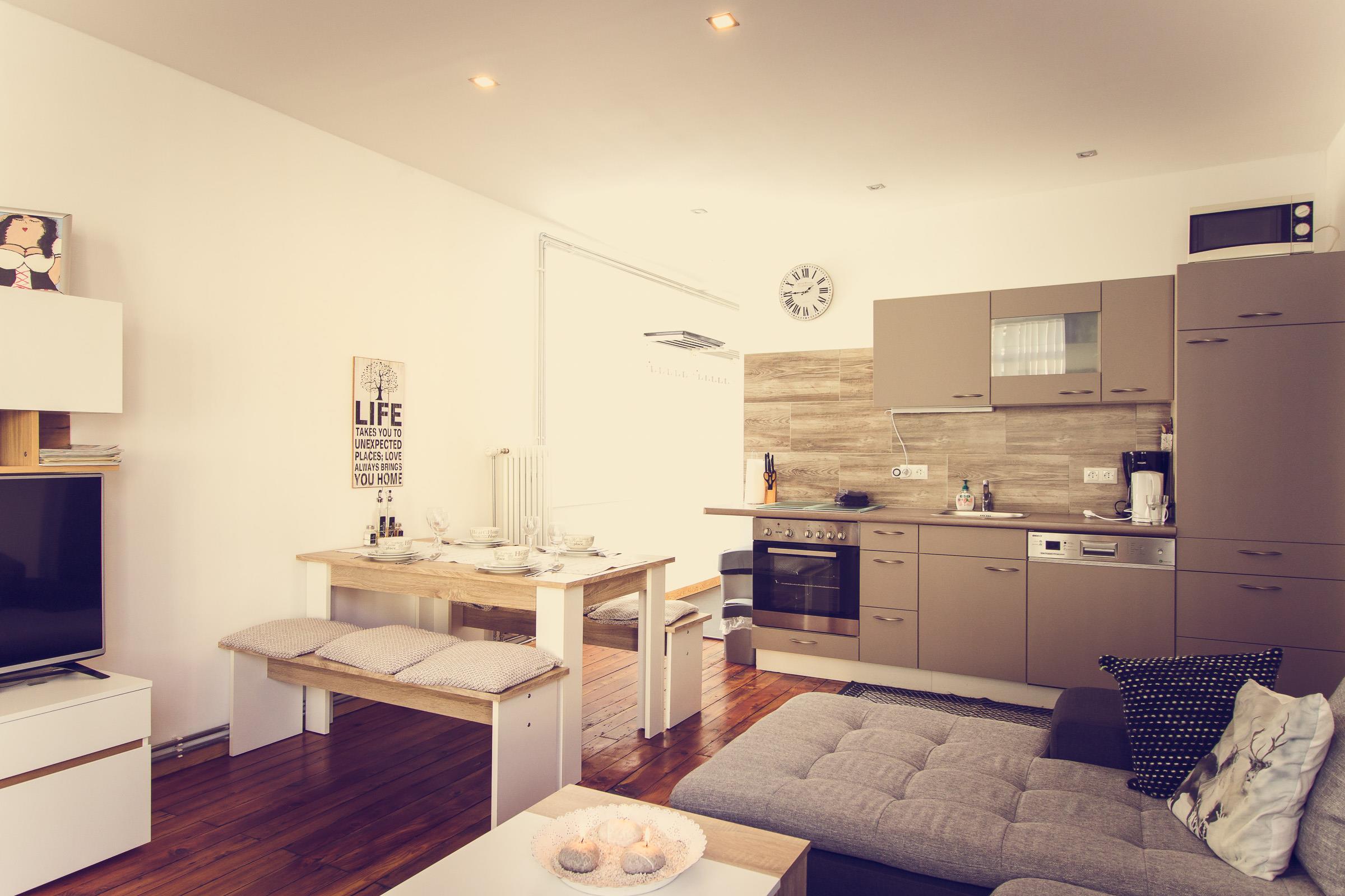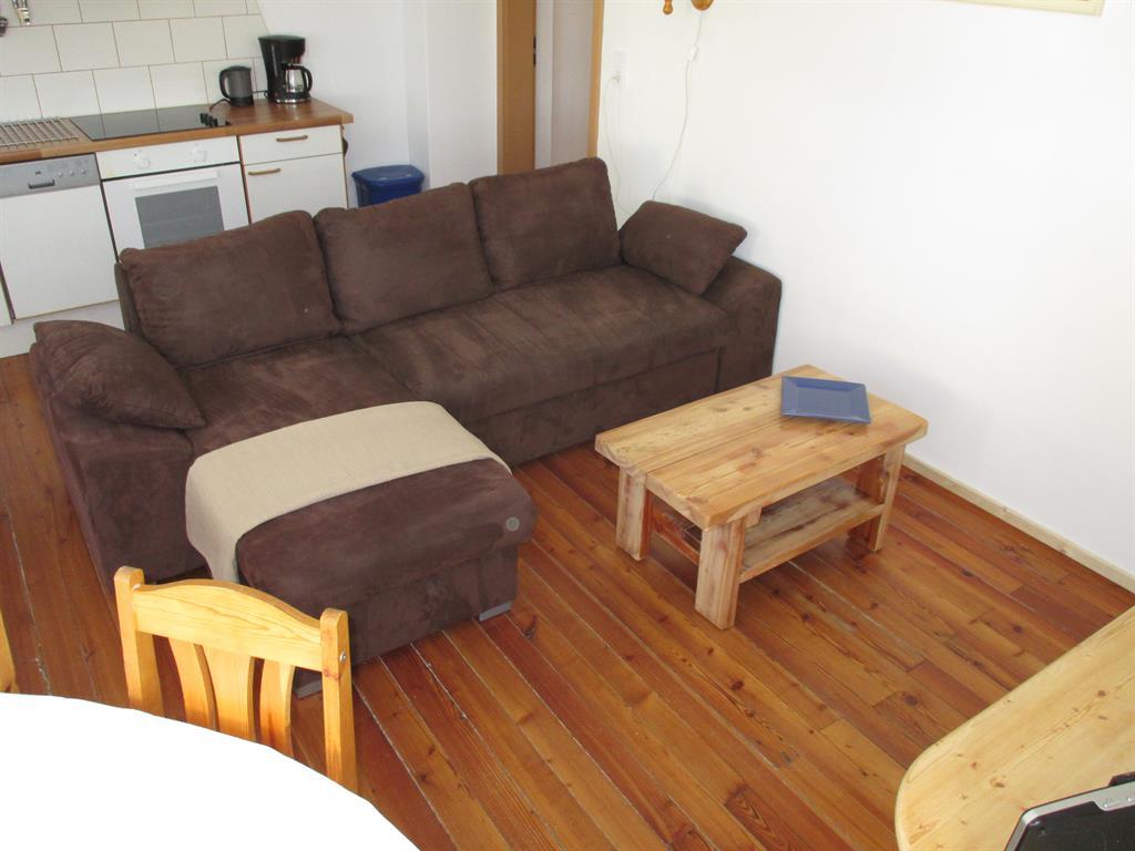 Im Appartment 1 finden sie ein Wohnzimmer mit offener Küche (ausgestattet mit Kühlschrank, Kochstelle, Geschirrspüler usw.). Im Wohnzimmer steht eine große Couch mit Bettfunktion und Stauraum, und ein TV mit Sat-Anschluss.