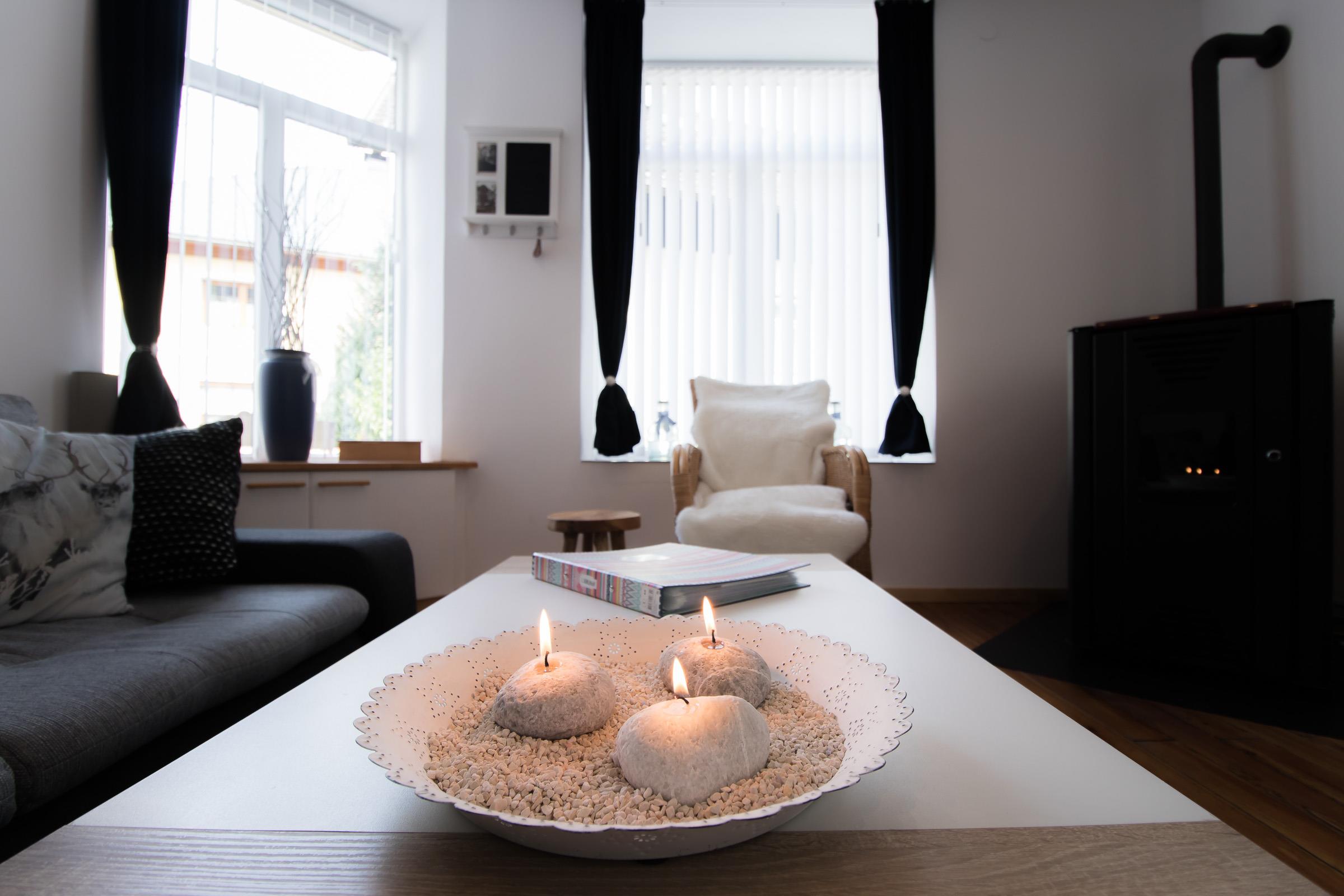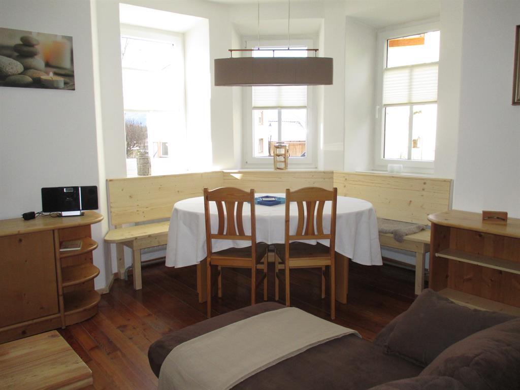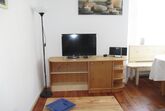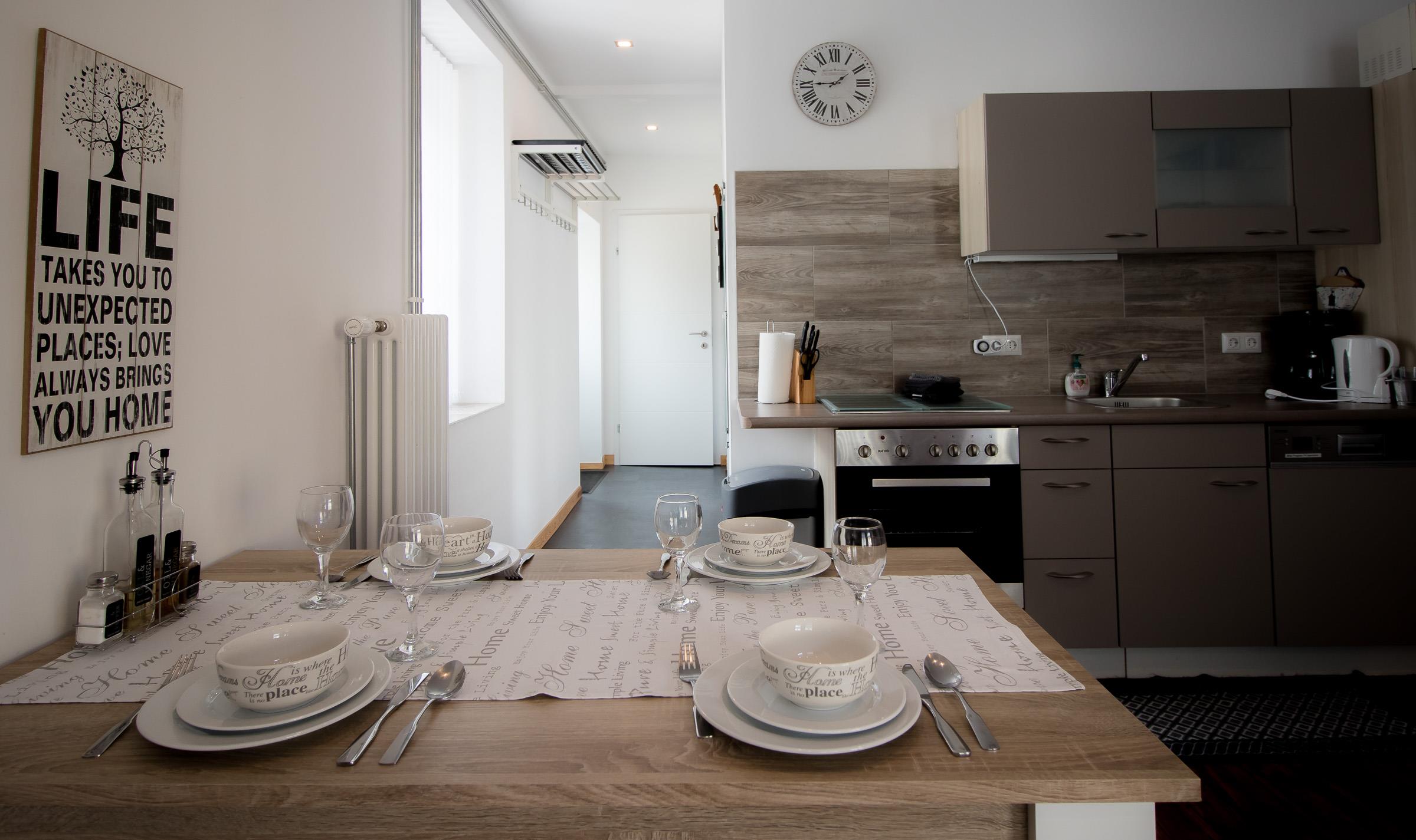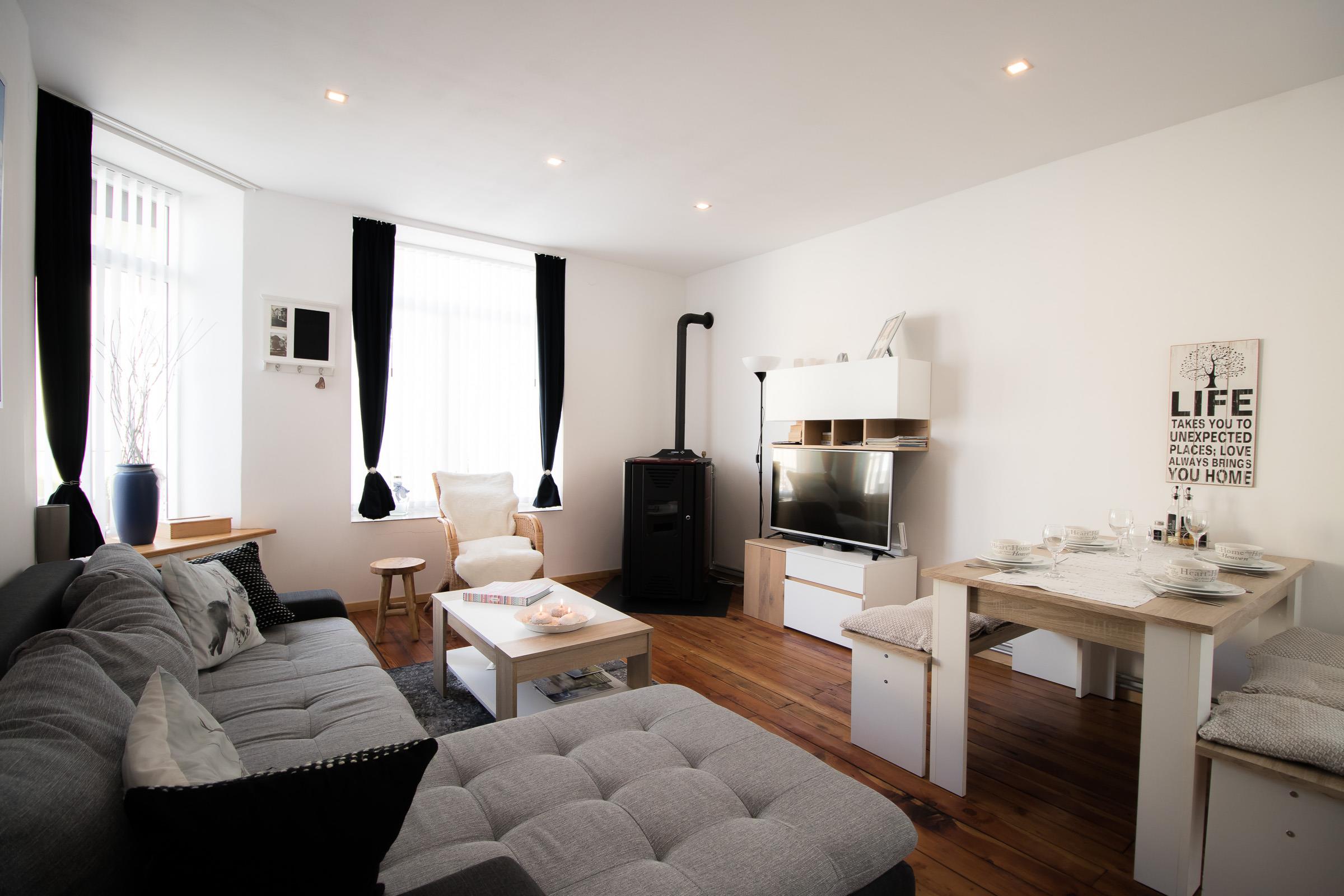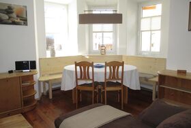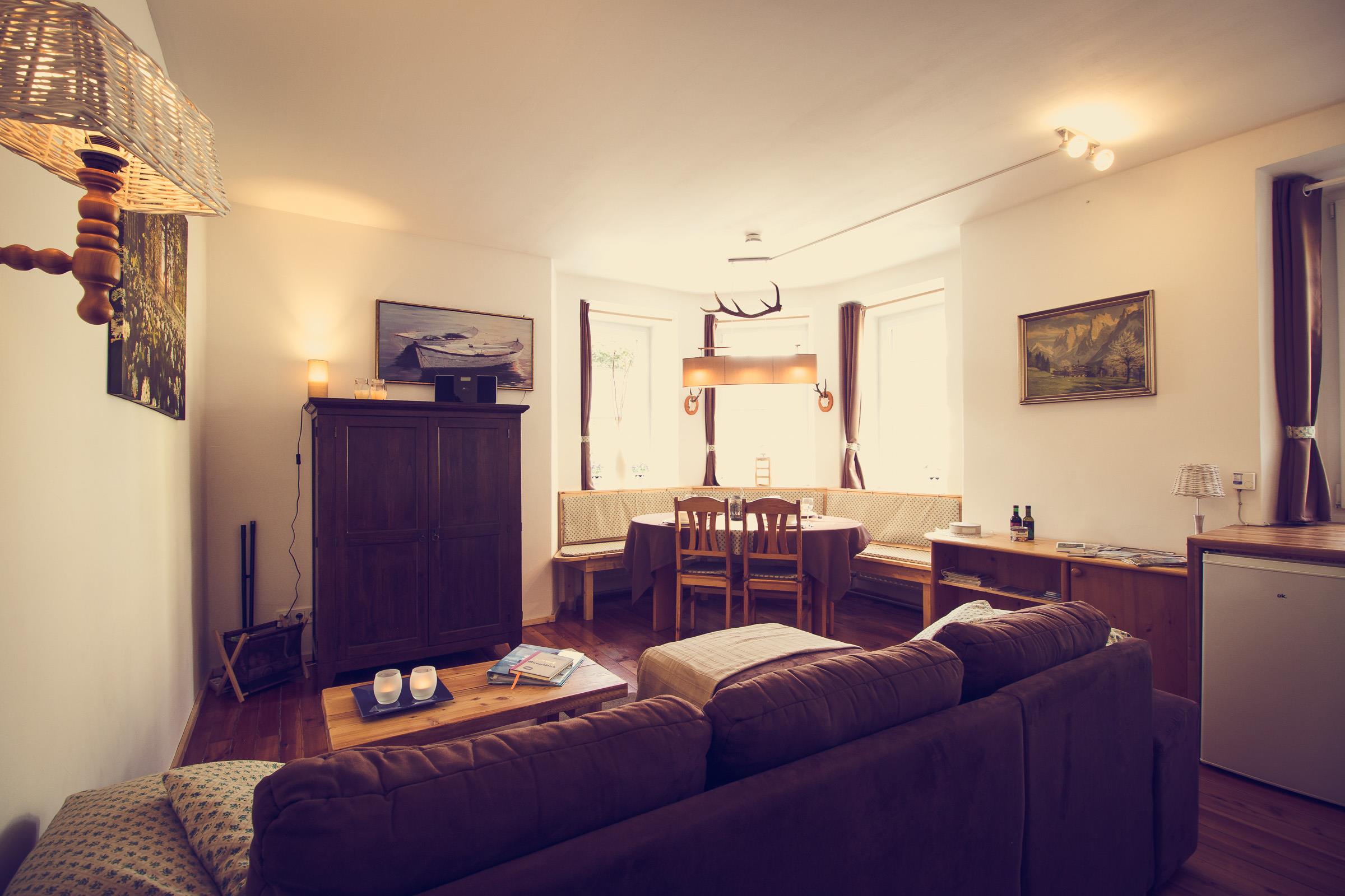 Im Appartment 1 finden sie ein Wohnzimmer mit offener Küche (ausgestattet mit Kühlschrank, Kochstelle, Geschirrspüler usw.). Im Wohnzimmer steht eine große Couch mit Bettfunktion und Stauraum, und ein TV mit Sat-Anschluss.