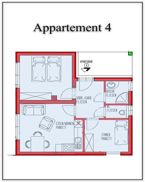 Das Appartement besteht aus einem Schlafzimmer mit Doppelbett, 1 Schlafzimmer mit 2 Einzelbetten, Wohnküche mit ausziehbarer Couch für 1 Personen, Dusche, WC separat, Terrasse.