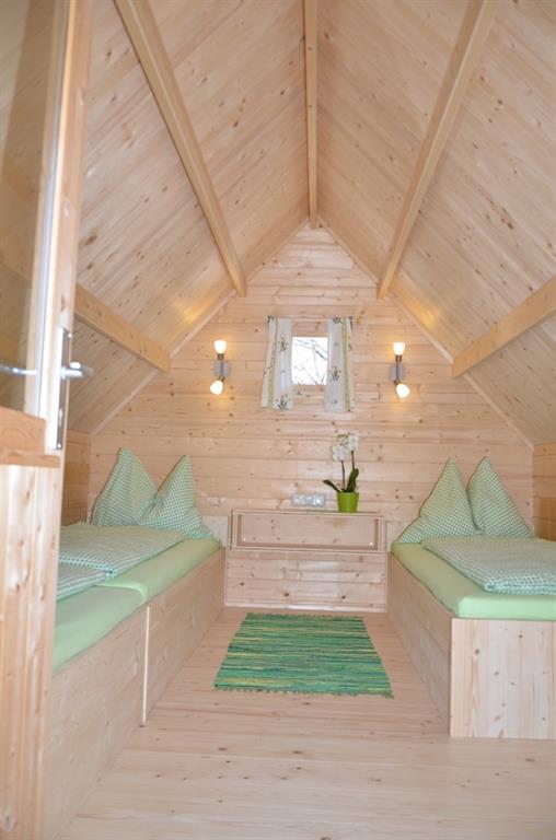 3 Einzelbetten in gemütlichen Holzhäuschen mit eigenem Balkon, der neu gestaltete Sanitärbereich befindet sich unmittelbar daneben.