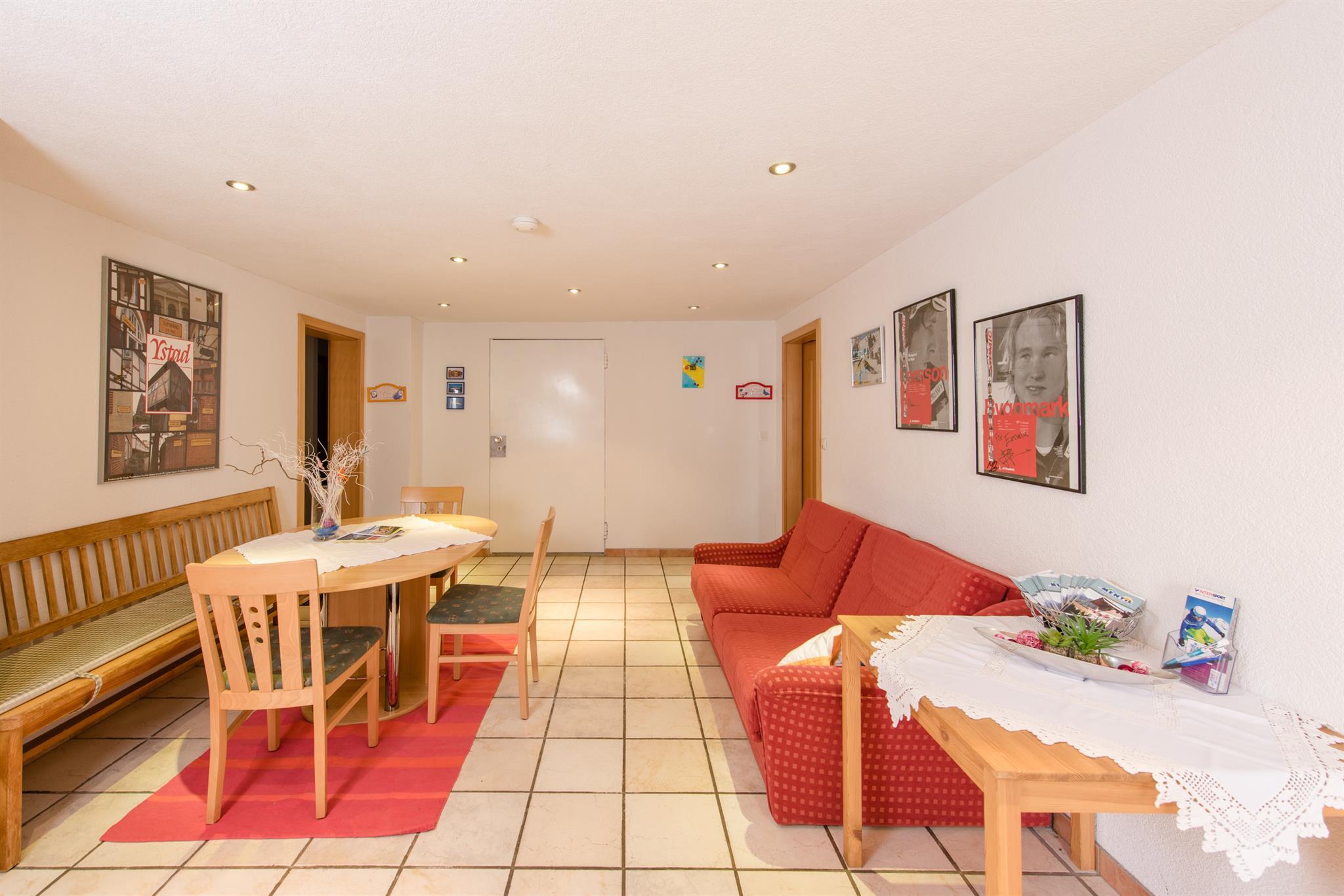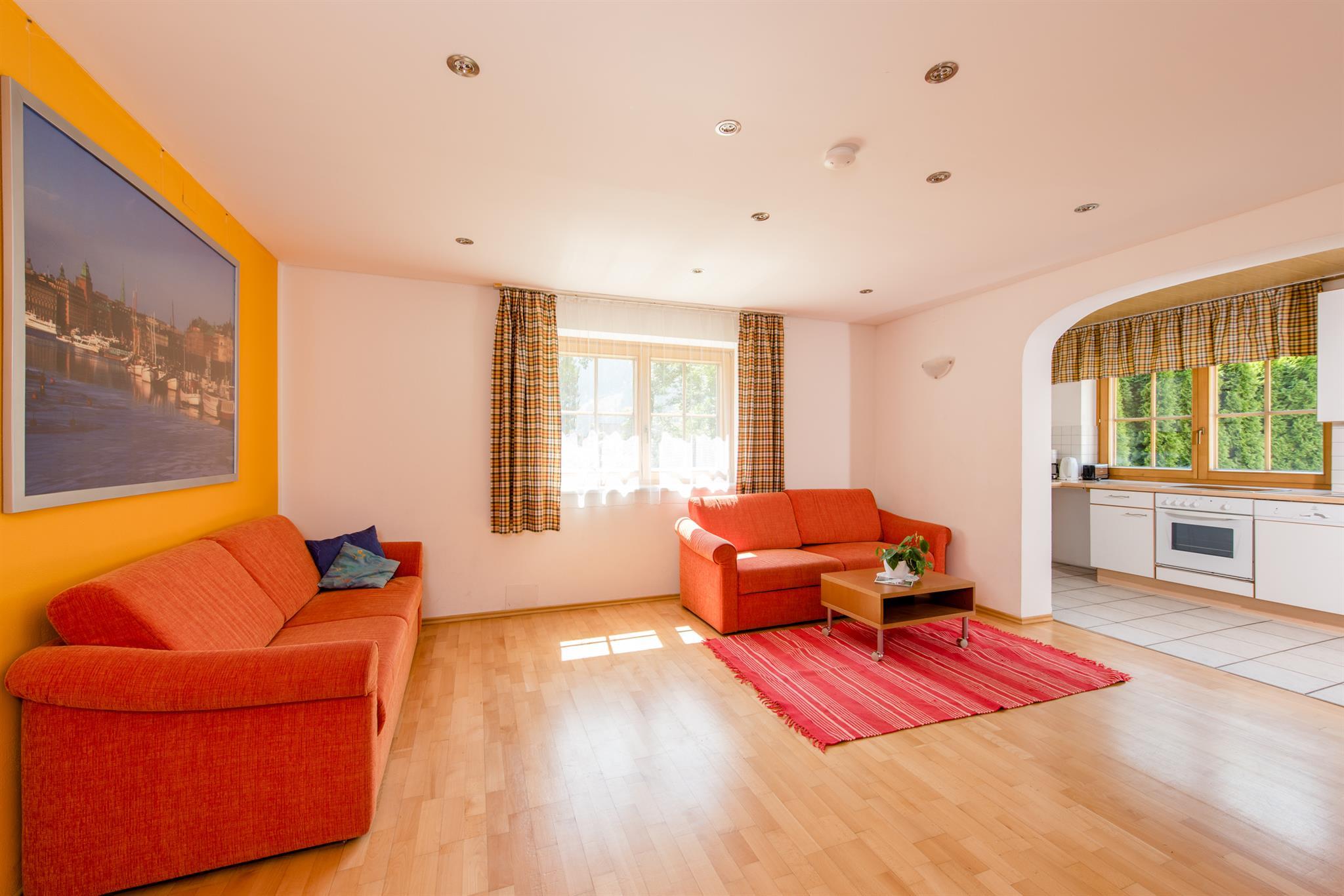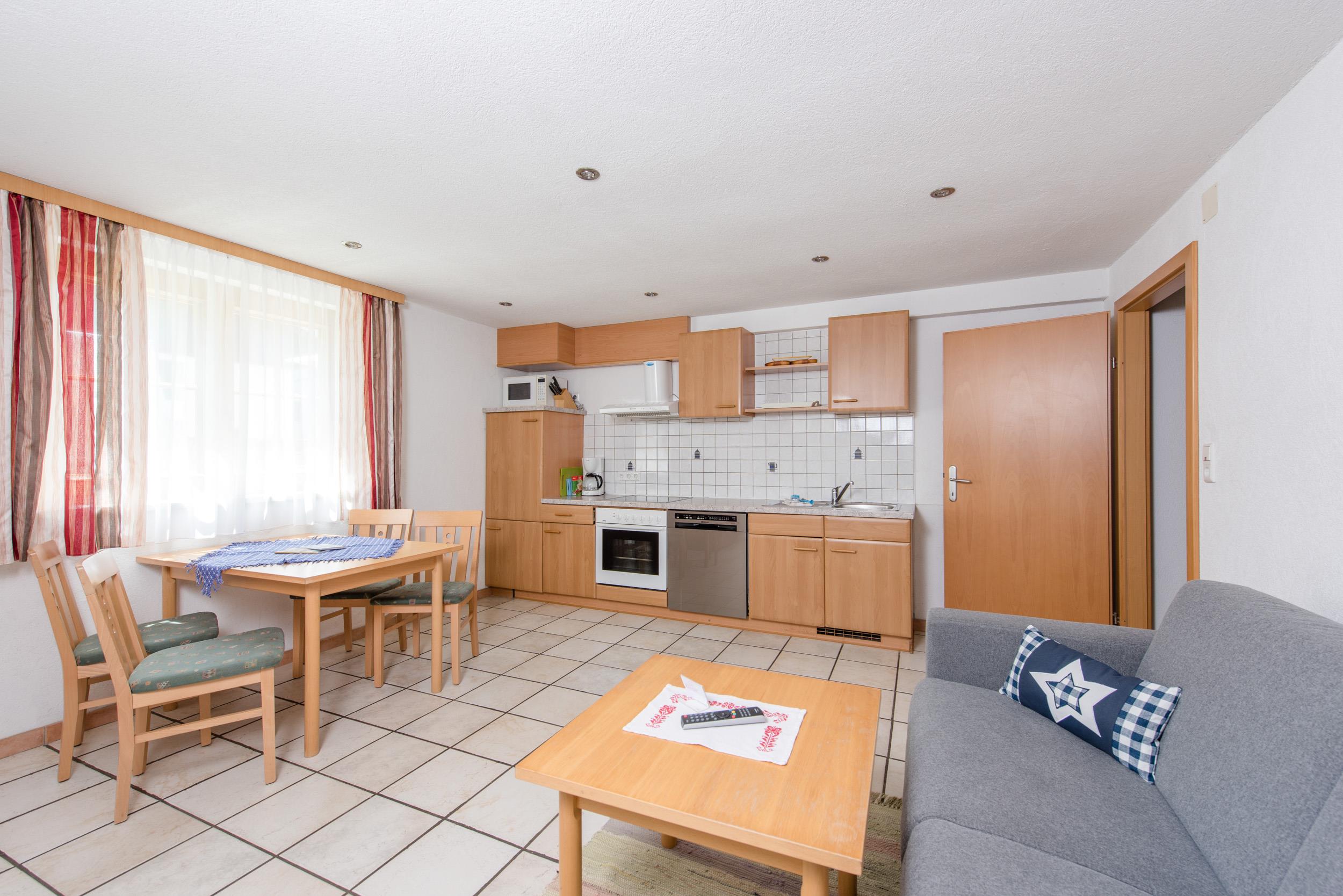 Schönes, großes Appartement für bis zu 6 Personen. Ein Doppelzimmer, Galerie mit 2 Einzelbetten, komb. Wohn- und Schlafraum mit 2 Schlafmöglichkeiten, Küchenblock mit Geschirrspüler, Mikrowelle, Wasserkocher, Elektroherd und Backrohr. Badezimmer mit Dusche/WC, Skiraum mit Schuhtrockner.