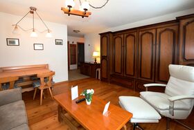 Die Wohnung befindet sich im Erdgeschoss und verfügt über ein traditionelles Wohnzimmer mit 2 Klappbetten und Flachbild-TV, eine schöne und geräumige Terrasse mit Garten und Südblick, ein helles Doppelzimmer mit eigener Terrasse und eine separates Küche mit Geschirrspüler, ein Badezimmer mit Badewanne.