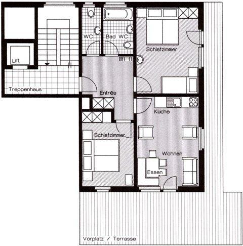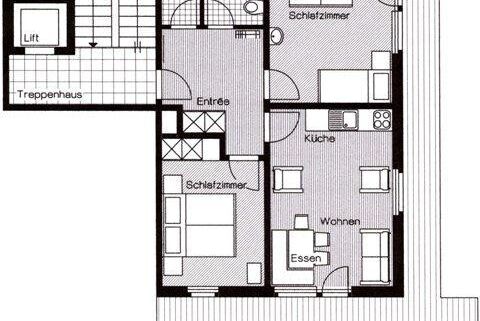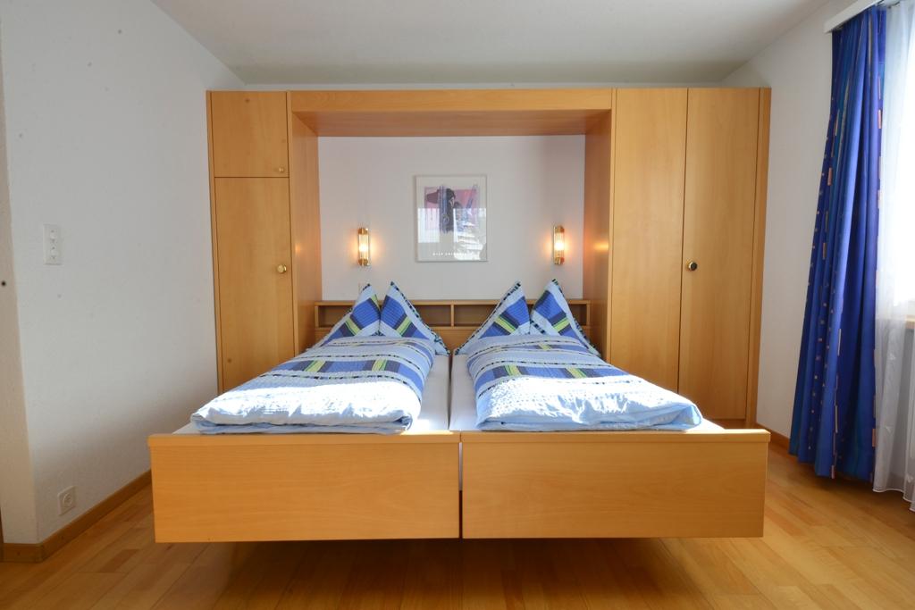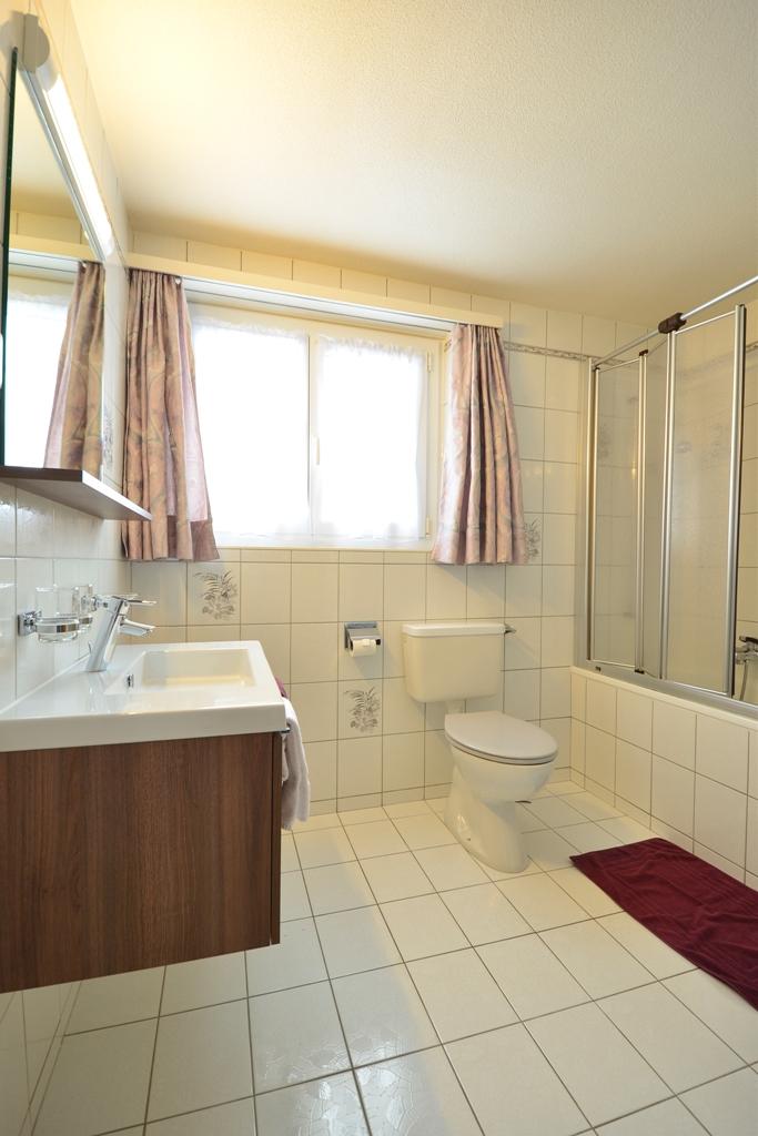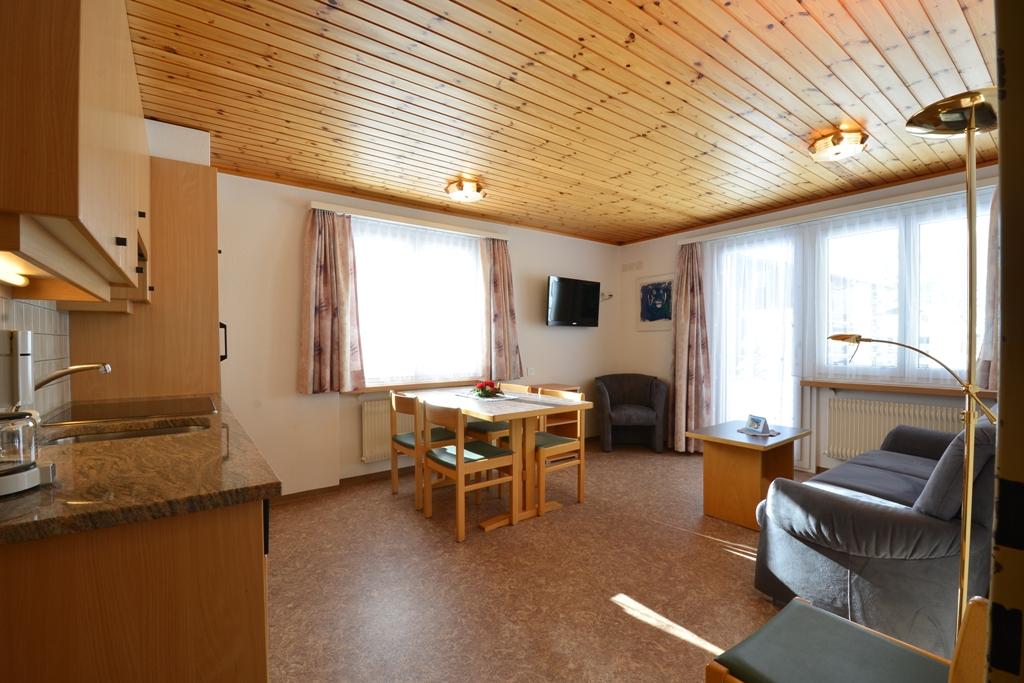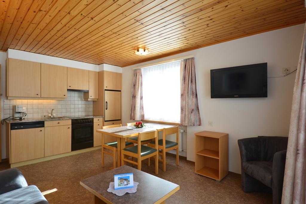 Moderne 3-Zimmerwohnung (5 Betten, 72 m2) im Erdgeschoss, Wohnküche (Esstisch, Polsterstühle, Farb-TV mit Flachbildschirm und Radio, Geschirrspüler), Doppelzimmer, Dreibettzimmer, Bad, separates WC, Süd-Terrasse, Telefonmiete möglich.
