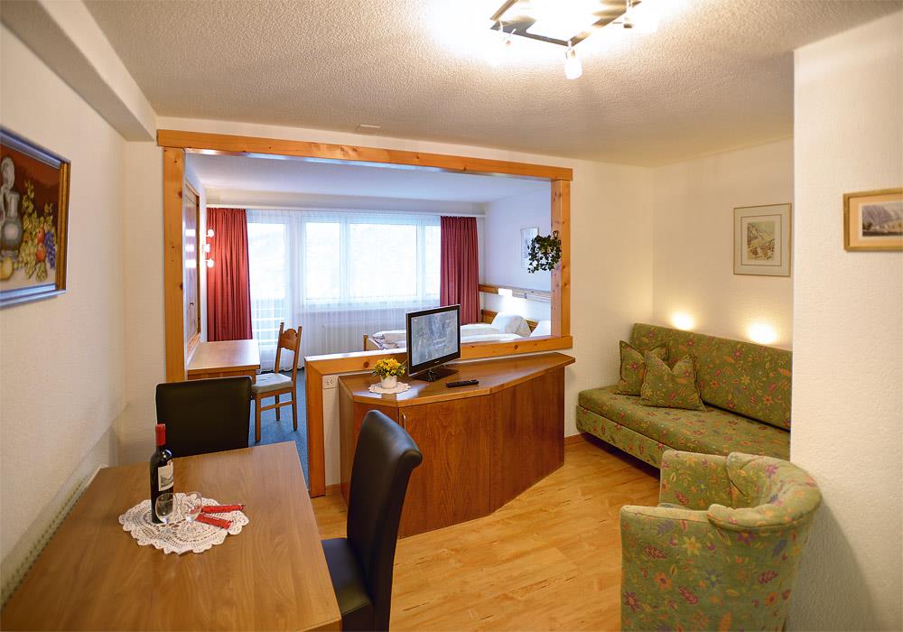 1-Zimmerwohung: Wohn/Esszimmer mit 2 Betten, großer Panorama-Südbalkon, Flachbildfernseher, Radio, Selbstwahltelefon, WIFI, separate Küche mit Glas-Keramikherd, Mikrowelle mit Grillfunktion, Geschirrspüler, Kühlschrank und Kaffee-Maschine. Dusche/WC und Fön. Garage zu mieten. Wellness-Bereich gegen Gebühr.