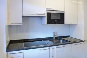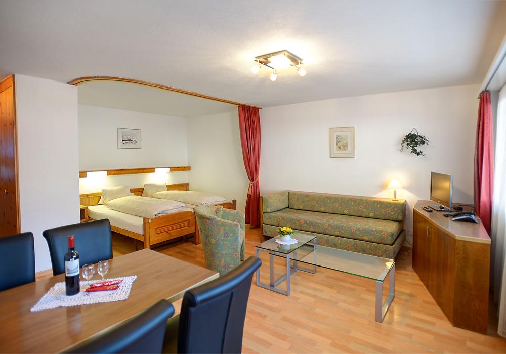 1-Zimmerwohung: Wohn/Esszimmer mit 2 Betten, großer Panorama-Südbalkon, Flachbildfernseher, Radio, Selbstwahltelefon, WIFI, separate Küche mit Glas-Keramikherd, Mikrowelle mit Grillfunktion, Geschirrspüler, Kühlschrank und Kaffee-Maschine. Dusche/WC und Fön. Garage zu mieten. Wellness-Bereich gegen Gebühr.