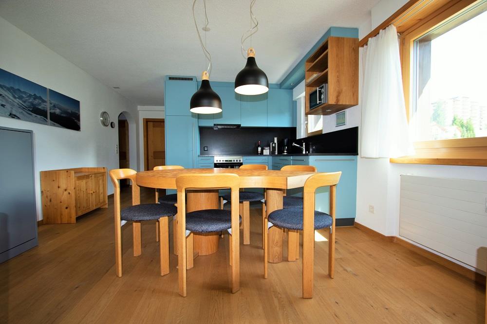 Schöne, grosse und helle 2 ½-Zimmer-Eck-Wohnung (68 m2); zentral und doch ruhig gelegen, wintersichere Zufahrt, wenige Gehminuten zur Busstation an der Promenade und zur Parsennbahn, oberste Etage in Mehrfamilienhaus mit Lift; 2019 renoviert bzw. erneuert; Parkettboden, Süd- und Ost-Balkon ums Eck, Wohnzimmer mit hochwertigen Möbeln, Ausziehcouch (140x200cm), Klappbett (90cmx200), TV/Radio/W-LAN, Schlafzimmer mit Doppelbett (2 Matratzen), grosser Schrank; offene Küche mit Backofen, Glaskeramikherd, grosser Kühlschrank, Gefrierfach, Geschirrspülmaschine, Mikrowelle, Kaffeemaschine, Toaster, Raclette-, Fonduegeschirr, Tischgrill; Bad/WC mit begehbarer Dusche; Separates Gäste-WC; Arbeitsplatz mit Bildschirm (Anschluss für Laptop), Tastatur/Maus, Laserdrucker und ergonomischer Bürohocker vorhanden; Sauna (Benutzung gegen Bezahlung), Waschmaschine, Trockner und Trockenraum, Spielzimmer, Skiraum, Abstellplatz für Fahrräder, reservierter Tiefgaragenplatz mit Direktzugang ins Haus; Küchentücher, Frottéewäsche, Bettwäsche; Nichtraucherwohnung; Haustiere sind nicht erlaubt.