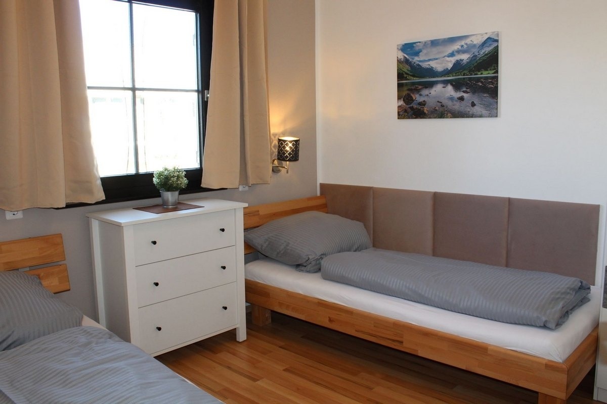mit Doppelbett und geräumigem Kleiderschrank. Auch von diesem Zimmer aus haben Sie Zutritt zur Terrasse.