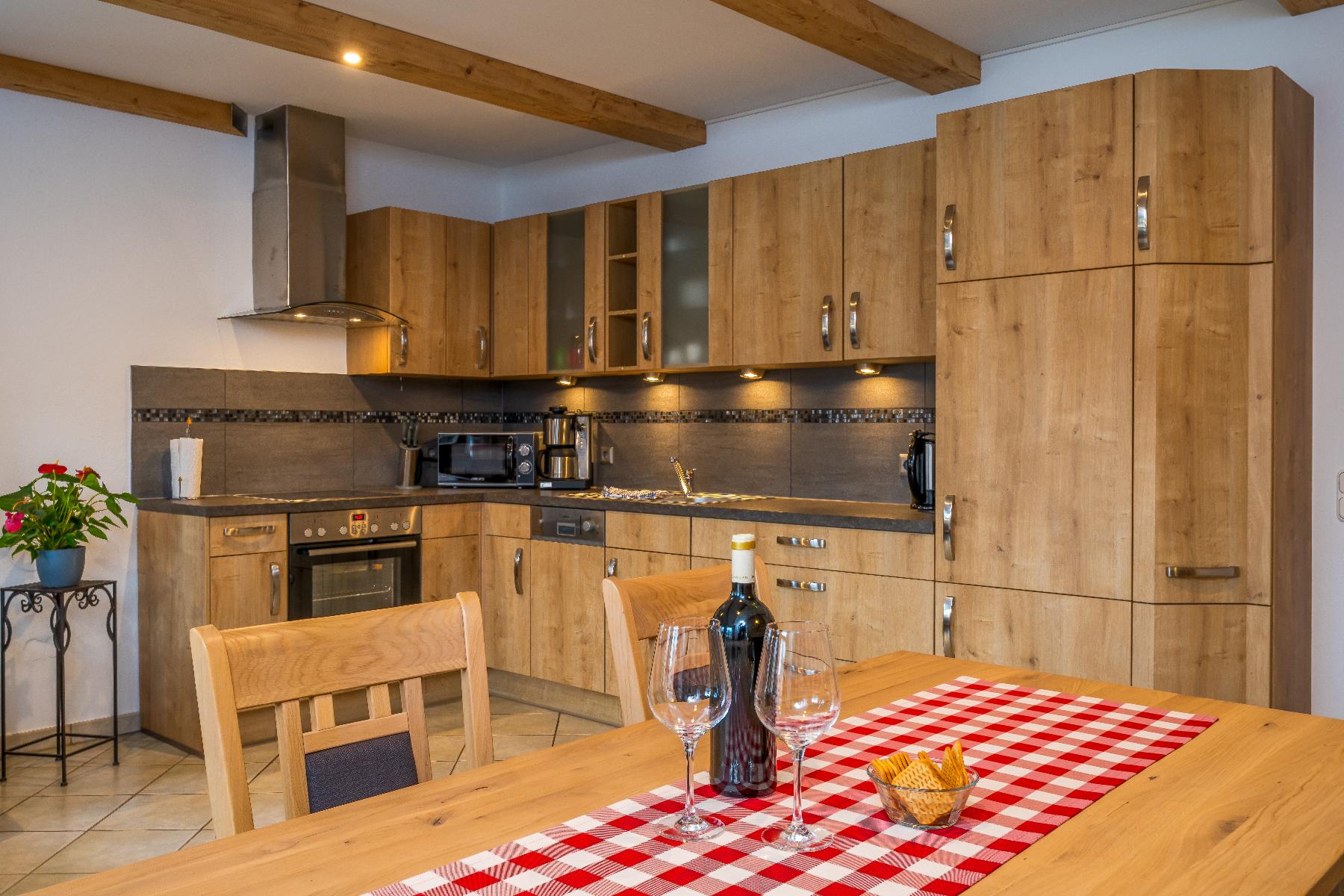 Herzlich willkommen in unserer großzügigen Ferienwohnung mit 65 Quadratmetern, ideal für 2 bis 4 Personen. Die Wohnung verfügt über zwei komfortable Schlafzimmer, die Ruhe und Erholung versprechen. Die Wohnküche ist komplett ausgestattet mit Herd, Backofen, Spülmaschine, Kühlschrank, Wasserkocher, Toaster, Kaffeemaschine und Mikrowelle.