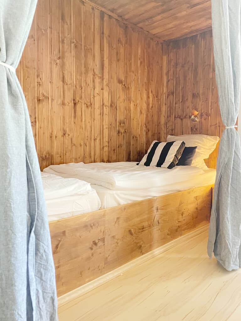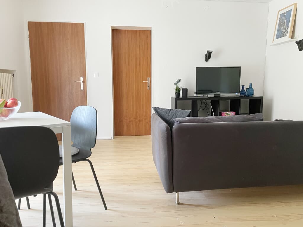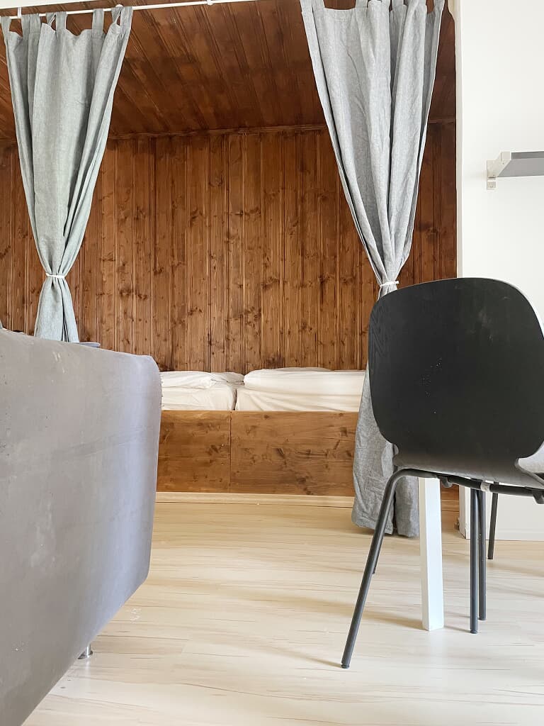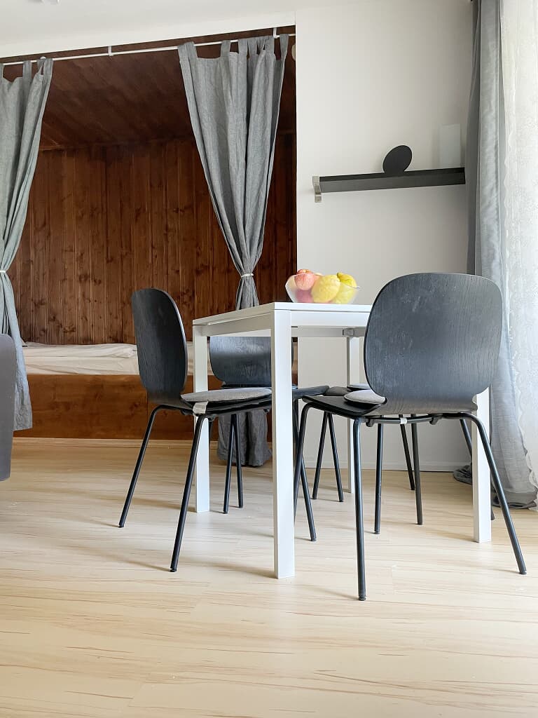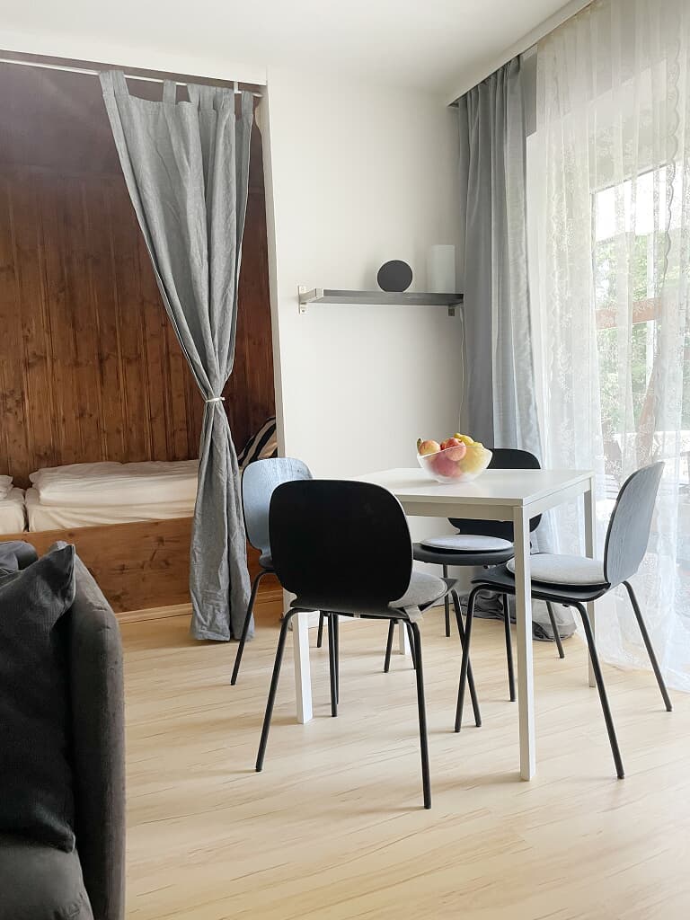Der Wohn- und Schlafraum ist einladend gestaltet und lädt zum Verweilen ein. Genießen Sie entspannte Abende vor dem Fernseher mit Zugang zu Amazon Prime, Netflix und Disney + – für unterhaltsame Stunden, auch an regnerischen Tagen. Die bequeme Couch lädt zum Kuscheln ein, während der Esstisch ausreichend Platz für ein leckeres Mahl bietet, das Sie in der voll ausgestatteten Küche zubereitet haben.