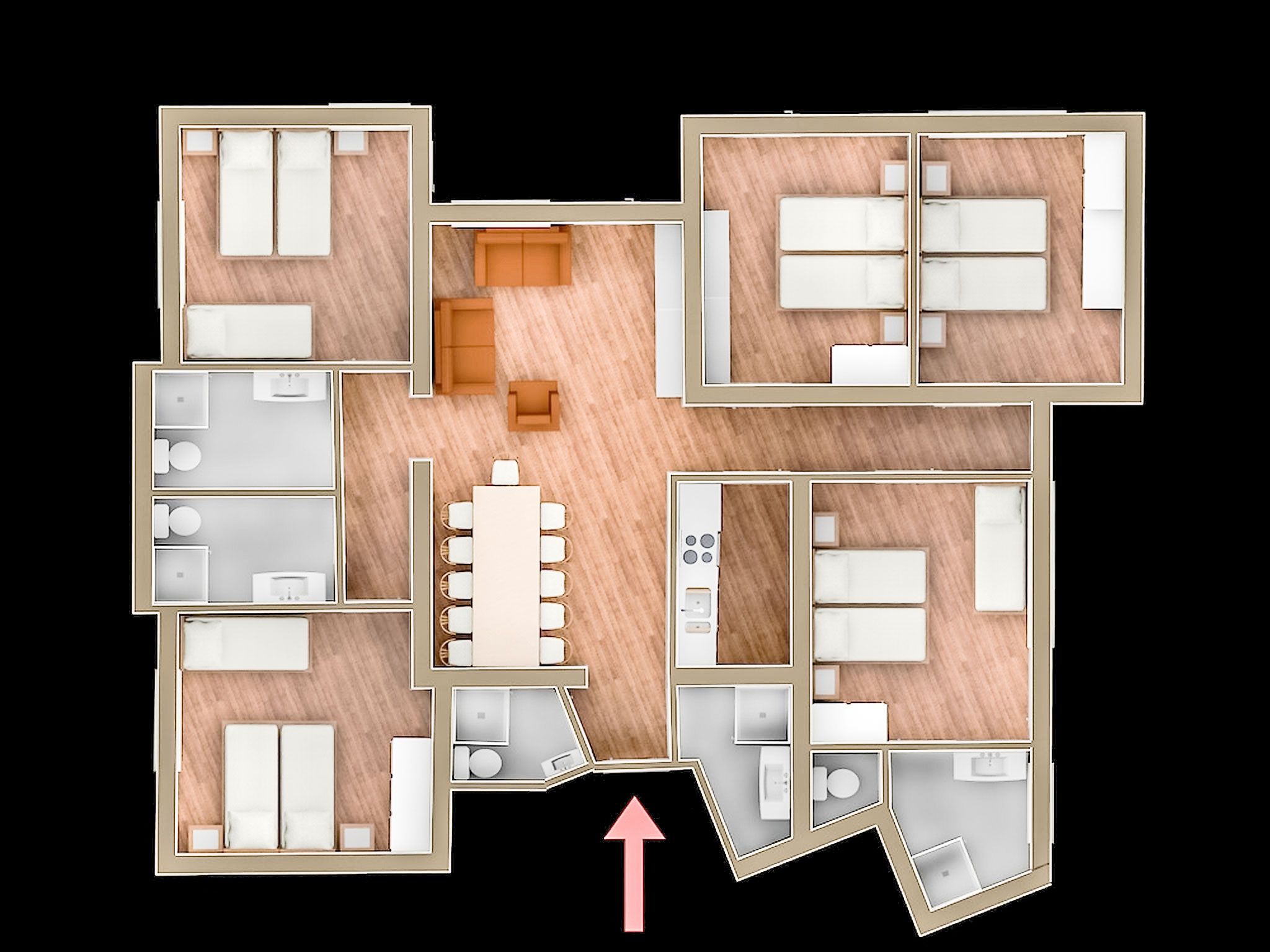 6-Zimmer-Wohnung 136 m2, im erhöhten Erdgeschoss. Geräumig, geschmackvoll eingerichtet: 3 Doppelzimmer, jedes Zimmer mit Kabel-TV (Flachbildschirm). 2 Zimmer, jedes Zimmer mit 1 Bett, 1 Doppelbett und Kabel-TV (Flachbildschirm). Wohn-/Esszimmer mit Sat-TV (Flachbildschirm). Offene Küche (Backofen, Geschirrspüler, 4 Glaskeramikplatten, Mikrowelle, elektrische Kaffeemaschine). 4 Duschen/WC, sep. WC, Doppelwaschbecken. Komfortable Einrichtung im Landhausstil. 2 Balkone, grosse Terrasse 25 m2. Herrliche Panoramasicht auf die Skipiste und die Ortschaft. Zur Verfügung: Telefon, Safe, Haartrockner. Internet (Wireless LAN, gratis). Parkplatz (4 Autos). Bitte beachten: Nichtraucher-Unterkunft. Rauchmelder. Alle Betten sind Boxspringbetten und können wahlweise als Doppel- oder Einzelbetten genutzt werden. Bei Belegung mit weniger Personen als der maximalen Personenzahl stehen nicht alle Wohneinheiten zur Verfügung.
