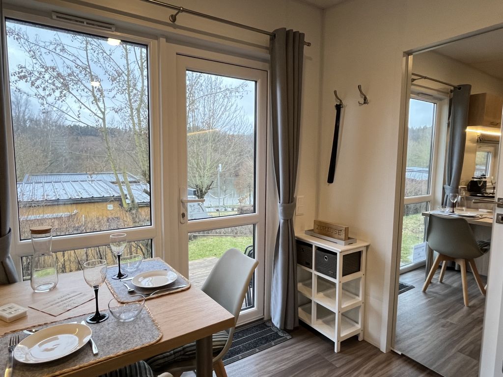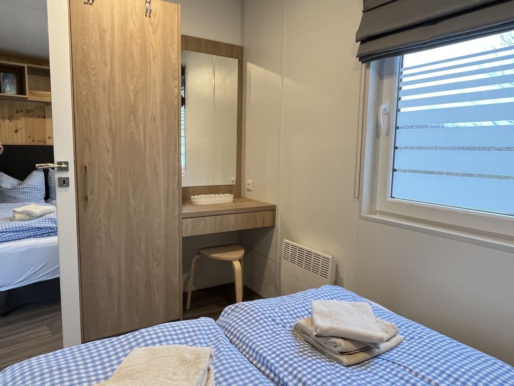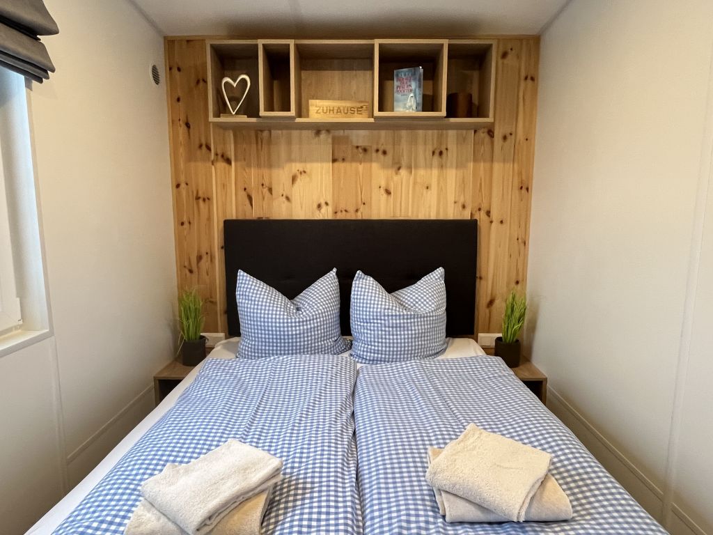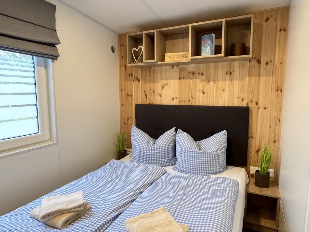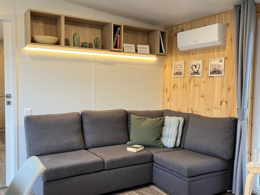 Tiny Haus mit schönem Seeblick, 2-Zimmer-Mobilheim 25 m2. Objekt geeignet für 2 Erwachsene + 1 Kind. Gemütlich eingerichtet: Wohn-/Esszimmer mit 1 Doppeldiwanbett und Sat-TV. Ausgang zur Terrasse. 1 Zimmer mit 1 franz. Bett (140 cm, Länge 200 cm). Offene Küche (Backofen, 2 Induktionskochplatten, Toaster, Wasserkocher, elektrische Kaffeemaschine). Dusche/WC. E-Heizung, Klimaanlage. Terrasse. Terrassenmöbel, Liegestühle (1). Bitte beachten: Nichtraucher-Haus. Erhöhte Lage mit Blick zum See. Balkonkraftwerk. Hinweis: Die WLAN-Verbindung kann je nach Kapazität eingeschränkt sei.