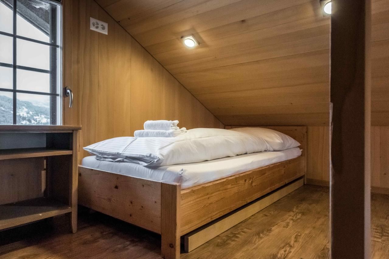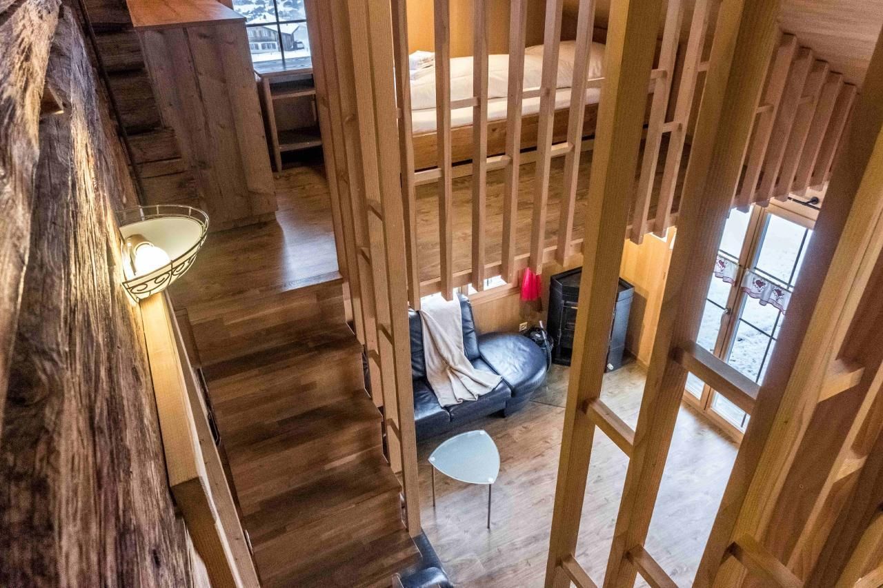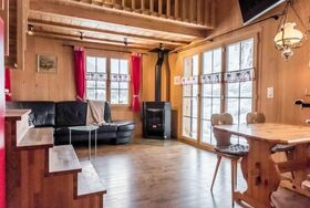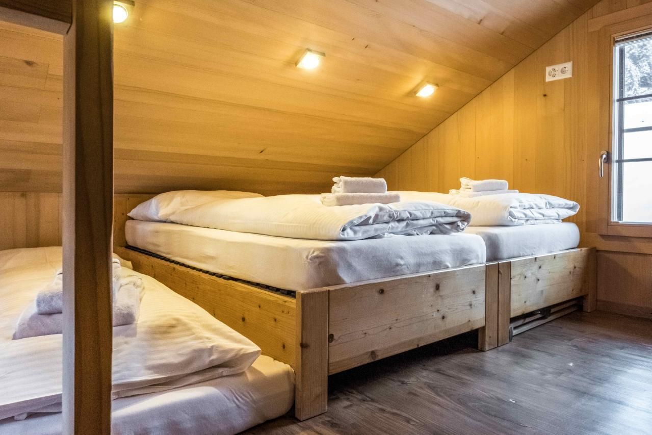 Die gemütlich eingerichtete 1-Zimmer-Maisonette-Wohnung ist mit viel Holz und Liebe zum Detail eingerichtet. Im unteren Geschoss befindet sich ein Wohn- und Essbereich mit einem Cheminée für gemütliche Stunden, eine gute ausgestatte Küche sowie ein Badezimmer mit Dusche/WC. Im oberen Geschoss, das über eine steile Treppe erreichbar ist, gibt es ein kleines, offenes Zimmer mit zwei Einzelbetten und ein weiteres offenes Zimmer mit einem Einzelbett. Zusätzlich gibt es bei beiden Zimmern die Option ein Zusatzbett für eine weitere Personen zu buchen. Das Cottage ist somit buchbar für 1-5 Personen. Die offenen Schlafzimmer befinden sich in der Dachschräge und die Deckenhöhe in beiden Zimmern beträgt 50-170 cm.