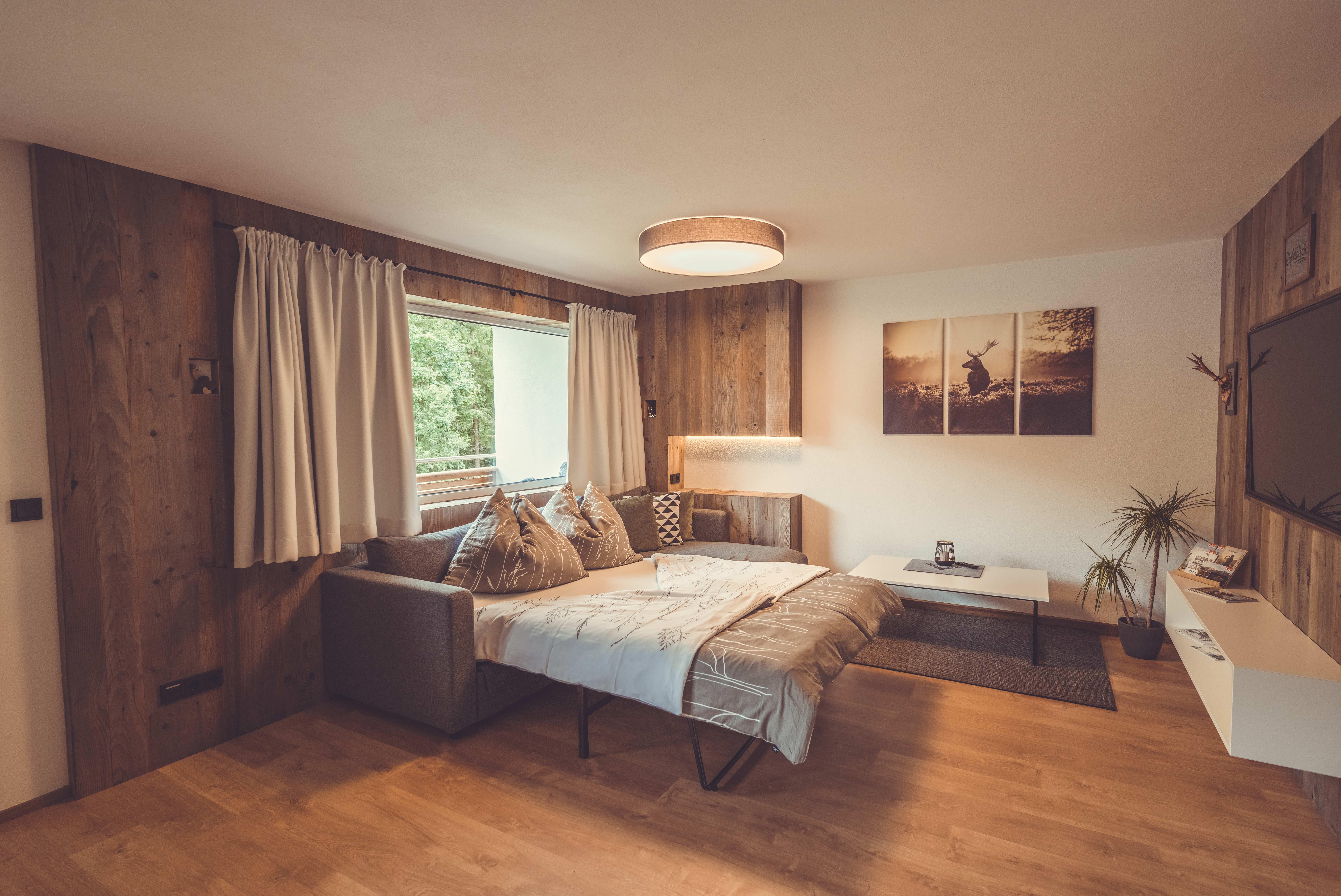 Unser Apartment bietet Gemütlichkeit auf 60 m². Aufgeteilt in ein Schlafzimmer, ein geräumiges Bad mit Regendusche und WC, Balkon, sowie einen offenen Wohn- und Essbereich mit einem Schlafsofa (1,40 x 2,00 m). Beide Räume verfügen über einen TV. Der private Garten lädt mit Grillplatz, Sonnenliegen, einer Schaukel zum Spielen und zum Verweilen ein. Für praktischen Komfort sorgt ein absperrbares Kellerabteil mit Skischuhtrockner sowie ein kostenfreies Carport.