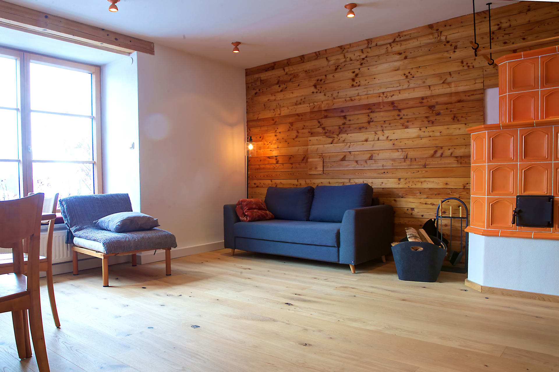 • Es gibt eine große Wohnküche mit Schlafcouch und einem Kachelofen, der im Winter für behagliche Wärme sorgt, ein kleines Schlafzimmer und Bad.