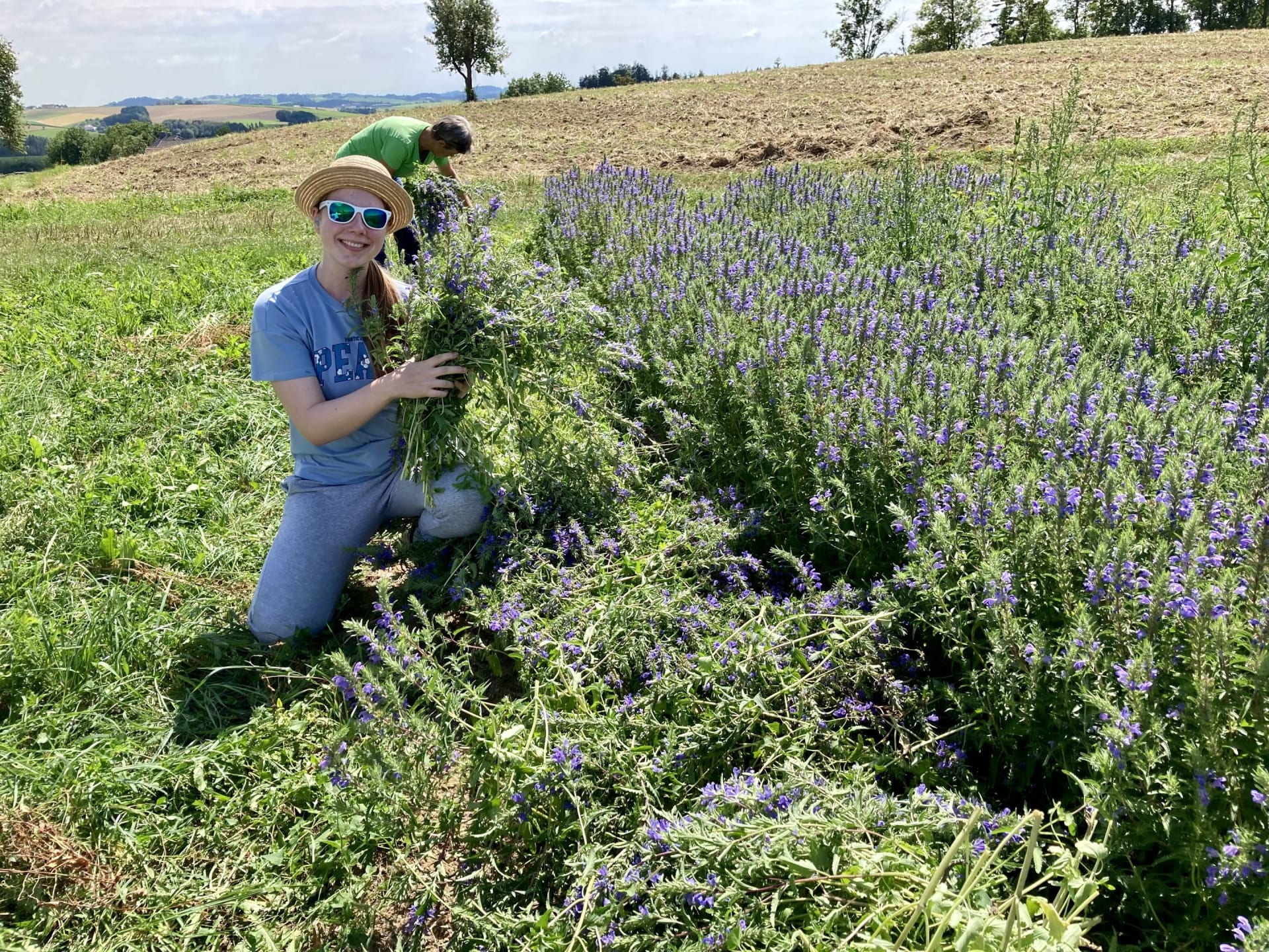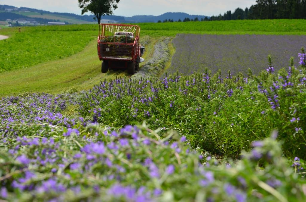 Der Sommer bringt die Getreidefelder zur Reife. Heu wird gemacht, es duftet und staubt, die Traktoren fahren, die Erntearbeiten beginnen. Der alte Mähdrescher tut seinen Dienst. Die Blüten für die Tees zupfen wir händisch von den Pflanzen und trocknen sie gemeinsam mit den Minzen und Melissen.