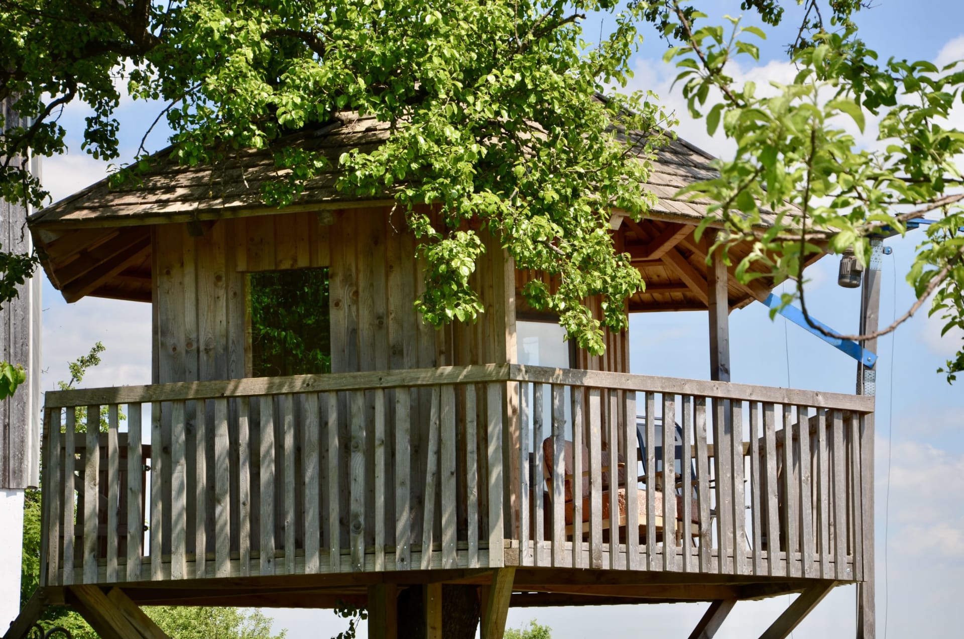 • Durchs Fenster (oder die Tür) gelangt man in den dazugehörigen Garten und zu einer Sonnenterrasse mit atemberaubender Aussicht. Liegestühle und Sonnenschirm gibt’s natürlich auch.