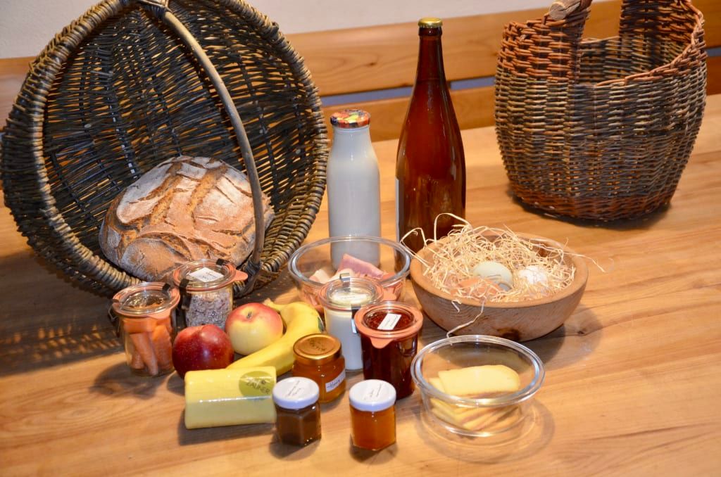 Wir bereiten gerne einen Frühstückskorb mit Bio-Produkten von unserem Hof und anderen Bauernhöfen der Region für Sie vor. Welche Köstlichkeiten sich darin befinden? Das sprechen wir gerne individuell mit Ihnen ab, damit wir auf Ihre Wünsche eingehen können. Hinweis: Sie können den Frühstückskorb auch nur für einzelne Tage buchen. Falls Sie das möchten, buchen Sie bitte ohne Verpflegung und sagen Sie uns Bescheid, an wie vielen Tagen Sie einen Frühstückskorb wünschen.