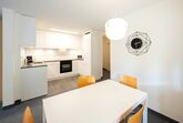 Offene Küche mit 4-Plattenherd Glaskeramik, Backofen, Kühlschrank, Gefrierschrank, Geschirrspüler, Mikrowelle, Kapsel-Kaffeemaschine (Delizio)