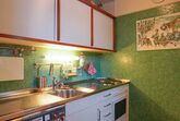Separate Küche mit Fenster und Dampfabzug, mit 3-Plattenherd, Kühlschrank, Tiefgefrierer,