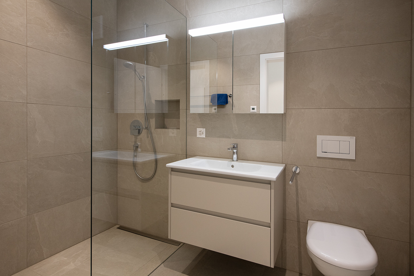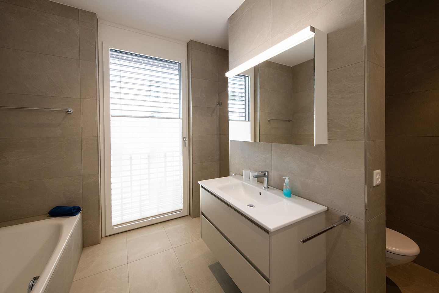 Bad mit Badewanne, sep. Duschkabine und WC, mit Waschmaschine und Tumbler,