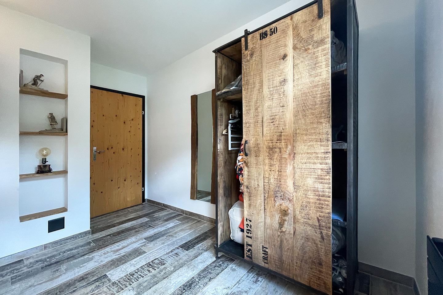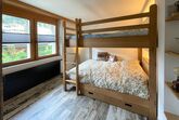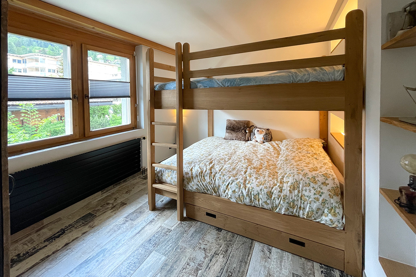 1 Schlafzimmer mit Etagenbett (160x200, unteres Bett 2 Matratzen 80x200, oberes Bett 1 Matratze 160x200).