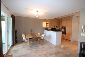 Offene Küche mit Dampfabzug, mit 4-Platten Glaskeramikherd, Kühlschrank mit Tiefgefrierfach, Backofen, Geschirrspüler,