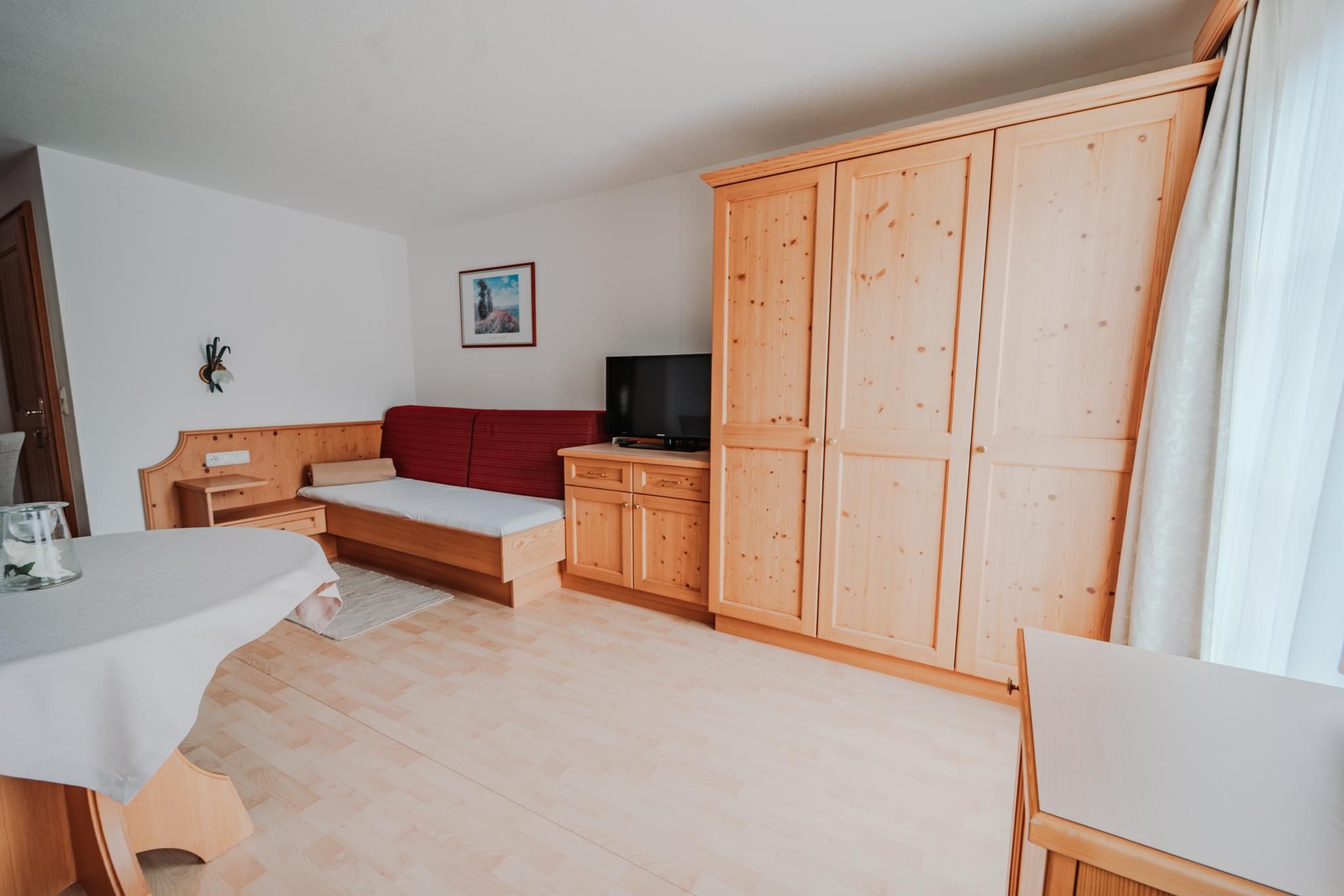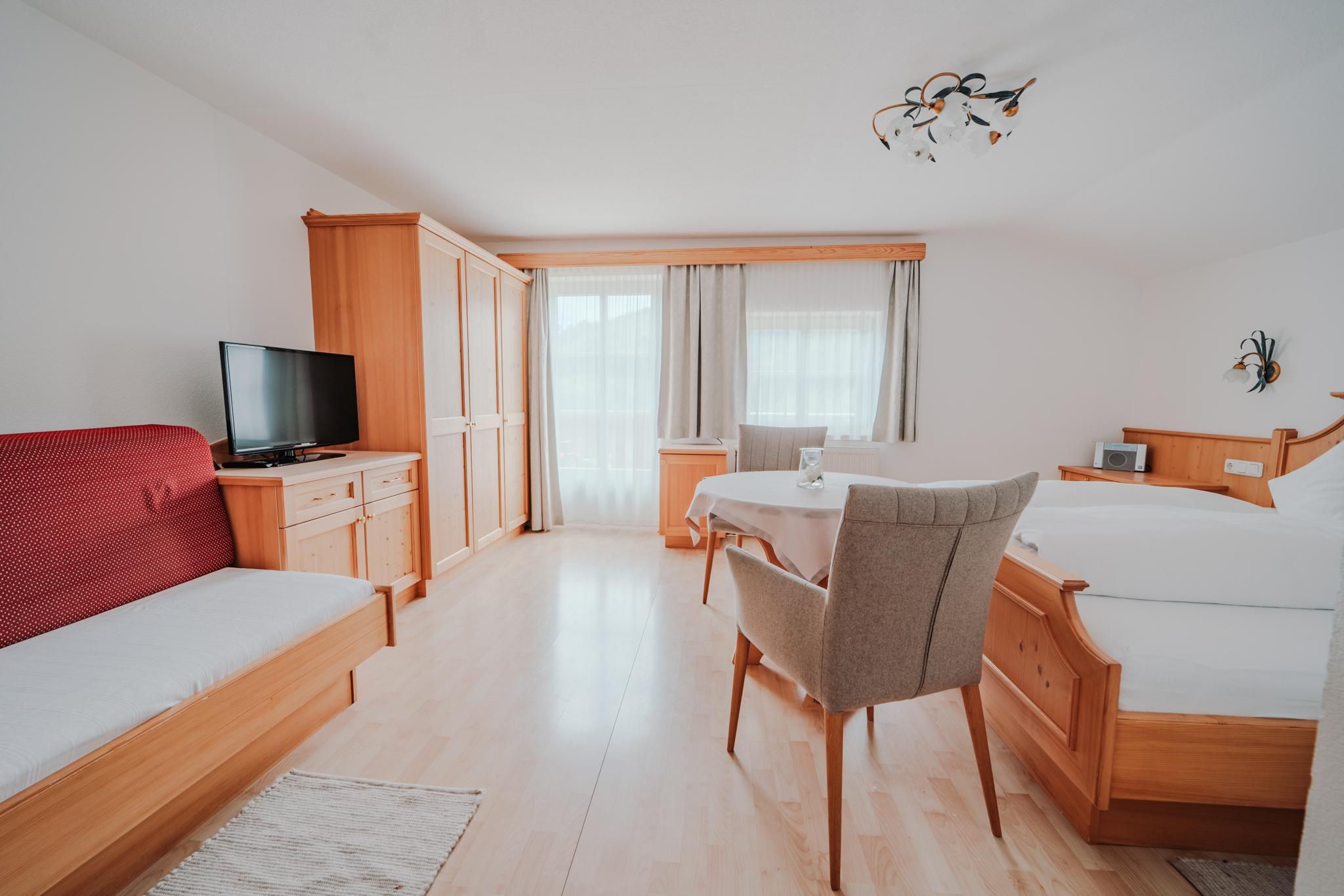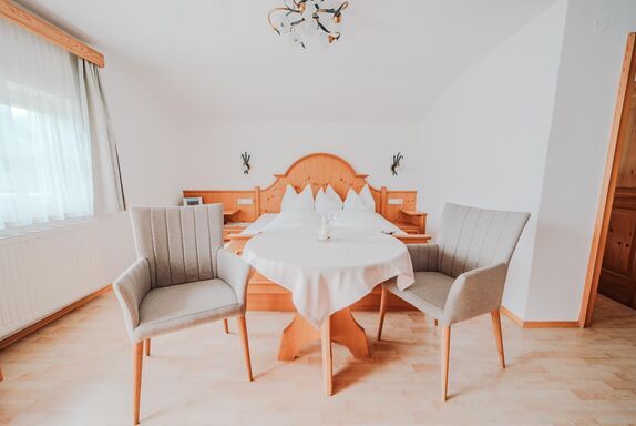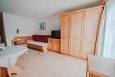 Dieses Zimmer ist ca. 30 m² groß, liegt südseitig und verfügt über einen Balkon, von dem Sie einen wunderbaren Ausblick auf unsere Bergwelt haben. Dusche, WC und Sat-TV sind natürlich vorhanden.