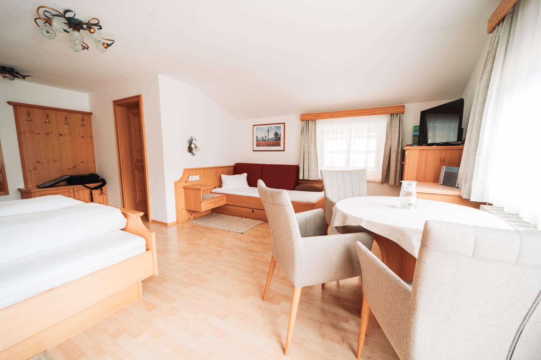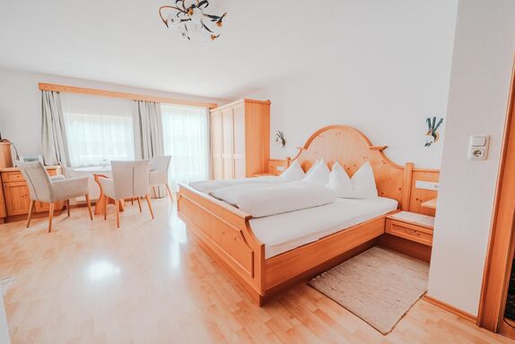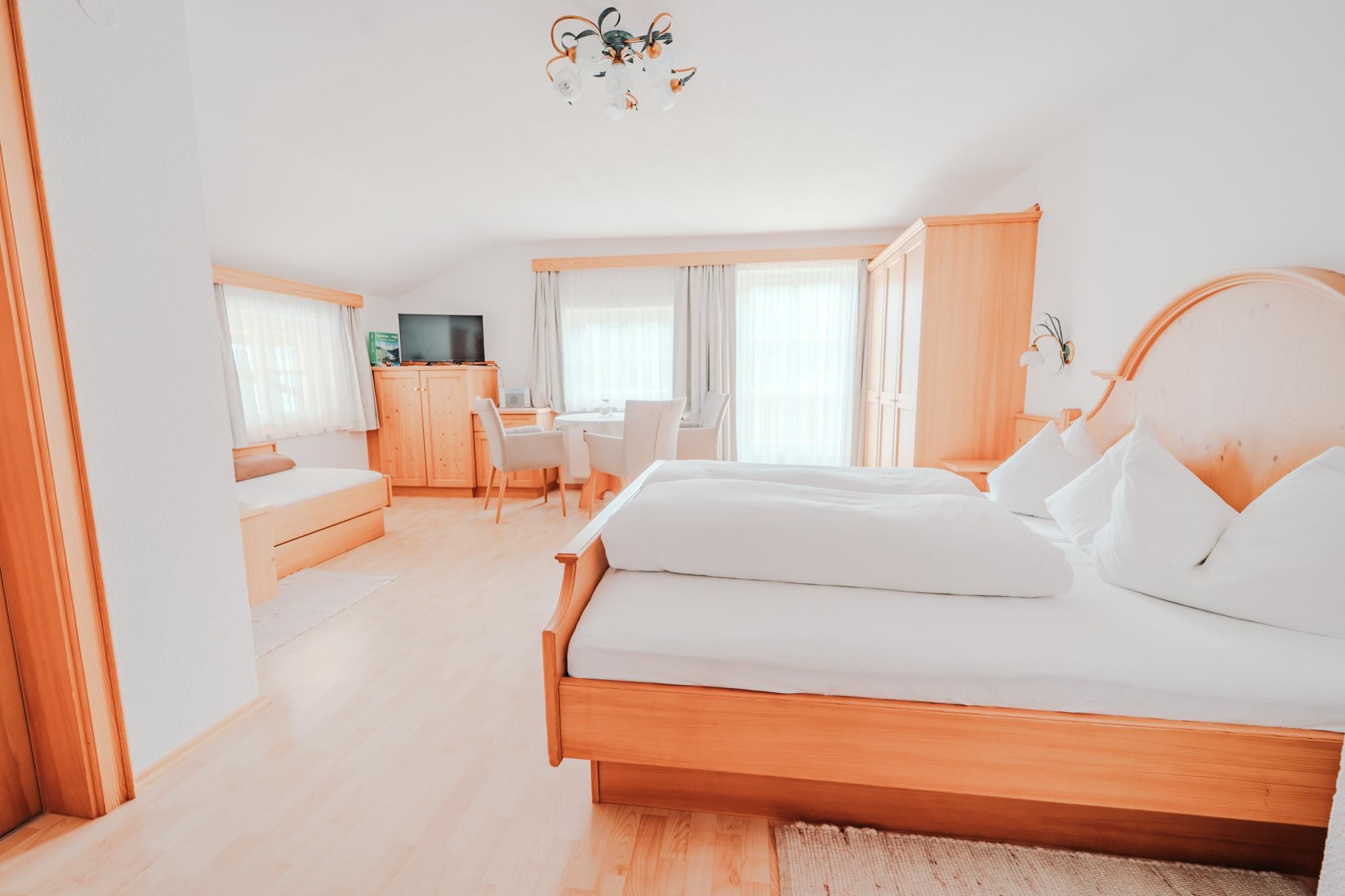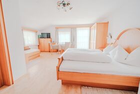 Dieses Zimmer ist ca. 30 m² groß, liegt südseitig und verfügt über einen Balkon, von dem Sie einen wunderbaren Ausblick auf unsere Bergwelt haben. Dusche, WC und Sat-TV sind natürlich vorhanden.