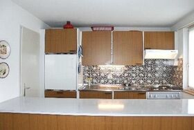 Separate Küche mit 3-Plattenherd, Kühlschrank mit Tiefgefrierfach, Backofen, Geschirrspüler, Kapsel-Kaffeemaschine.