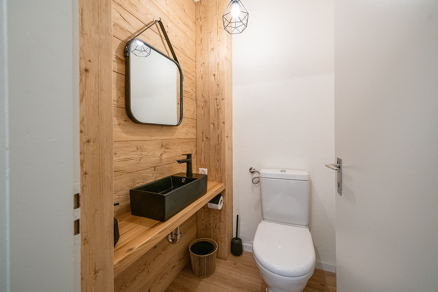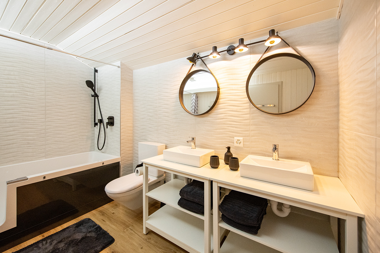 Bad mit begehbarer Badewanne/Dusche/WC/Doppellavabo.