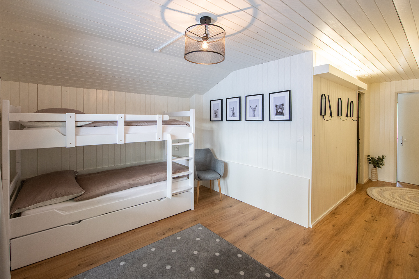 1 Etagenbett (80x200), 1 Bett ausziehbar unter Etagenbett, 1 Grand Lit seitlich klappbar (120x200).