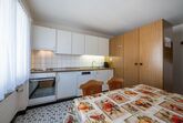 Offene Küche mit Fenster, Dampfabzug, mit 3-Platten Herd, Kühlschrank mit Tiefgefrierfach, Backofen,