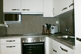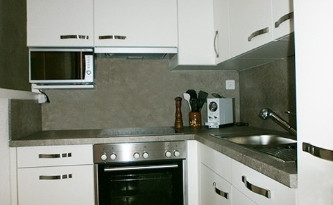 Separate Küche, mit 4-Platten Glaskeramikherd, Kühlschrank mit Tiefgefrierfach,