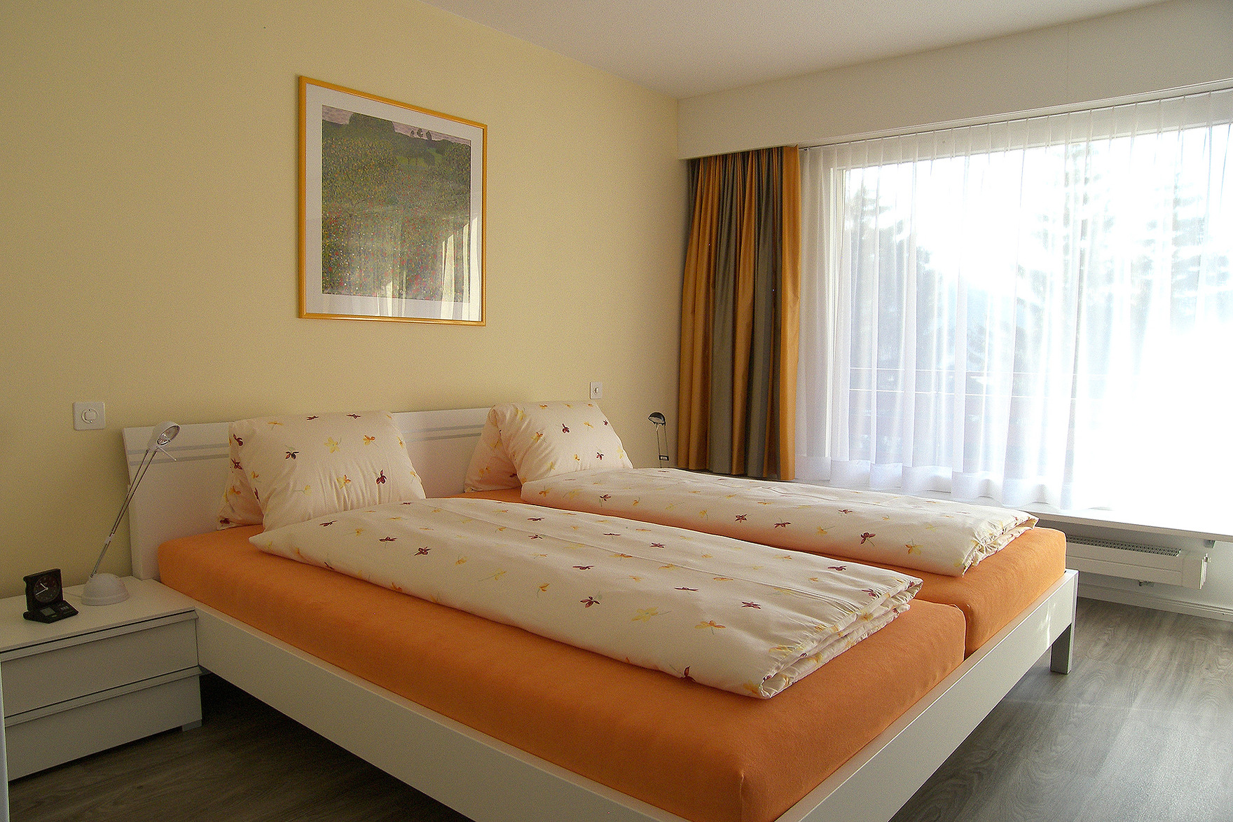 1 Schlafzimmer (½ Stock tiefer) mit Doppelbett (2 Matratzen).