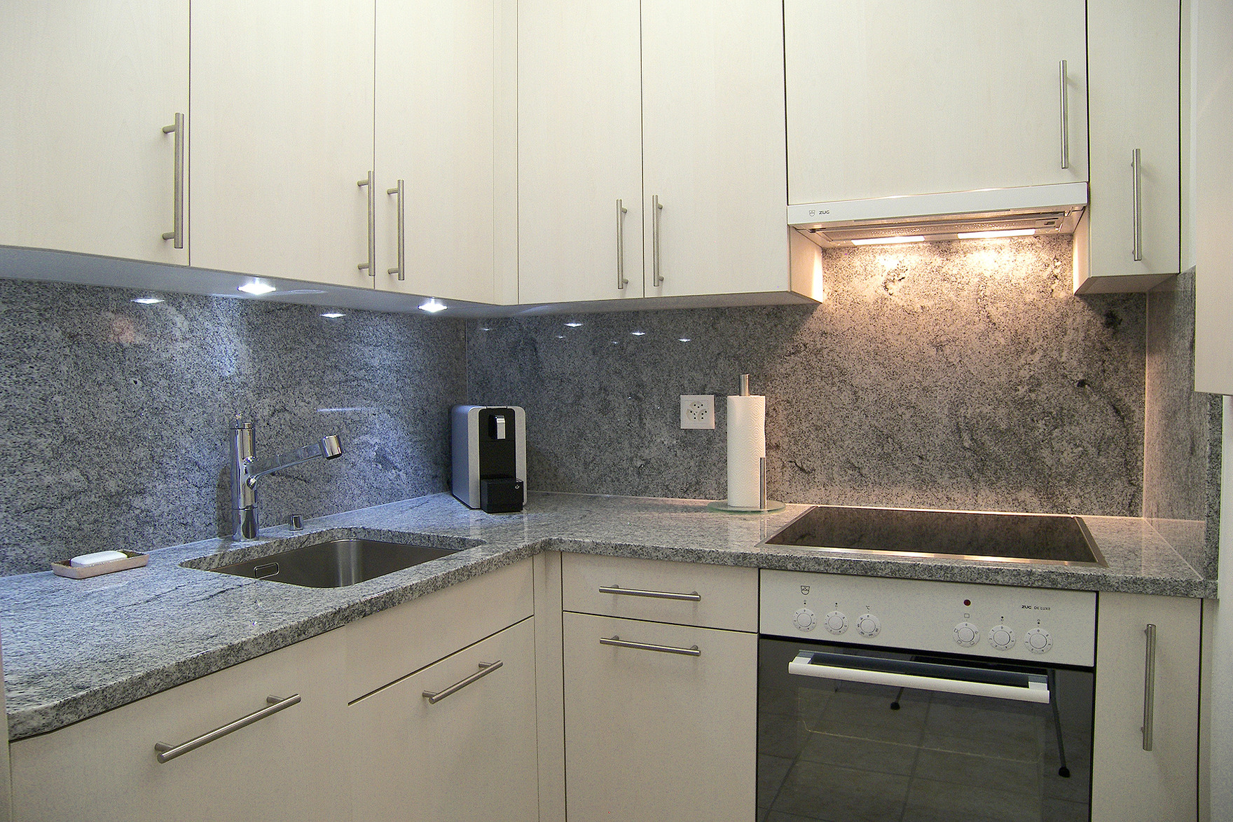 Separate Küche mit 4-Platten Glaskeramikherd, Kühlschrank mit Tiefgefrierfach,