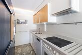 Offene Küche mit 4-Plattenherd, Kühlschrank mit Tiefgefrierfach, Backofen, Geschirrspüler.