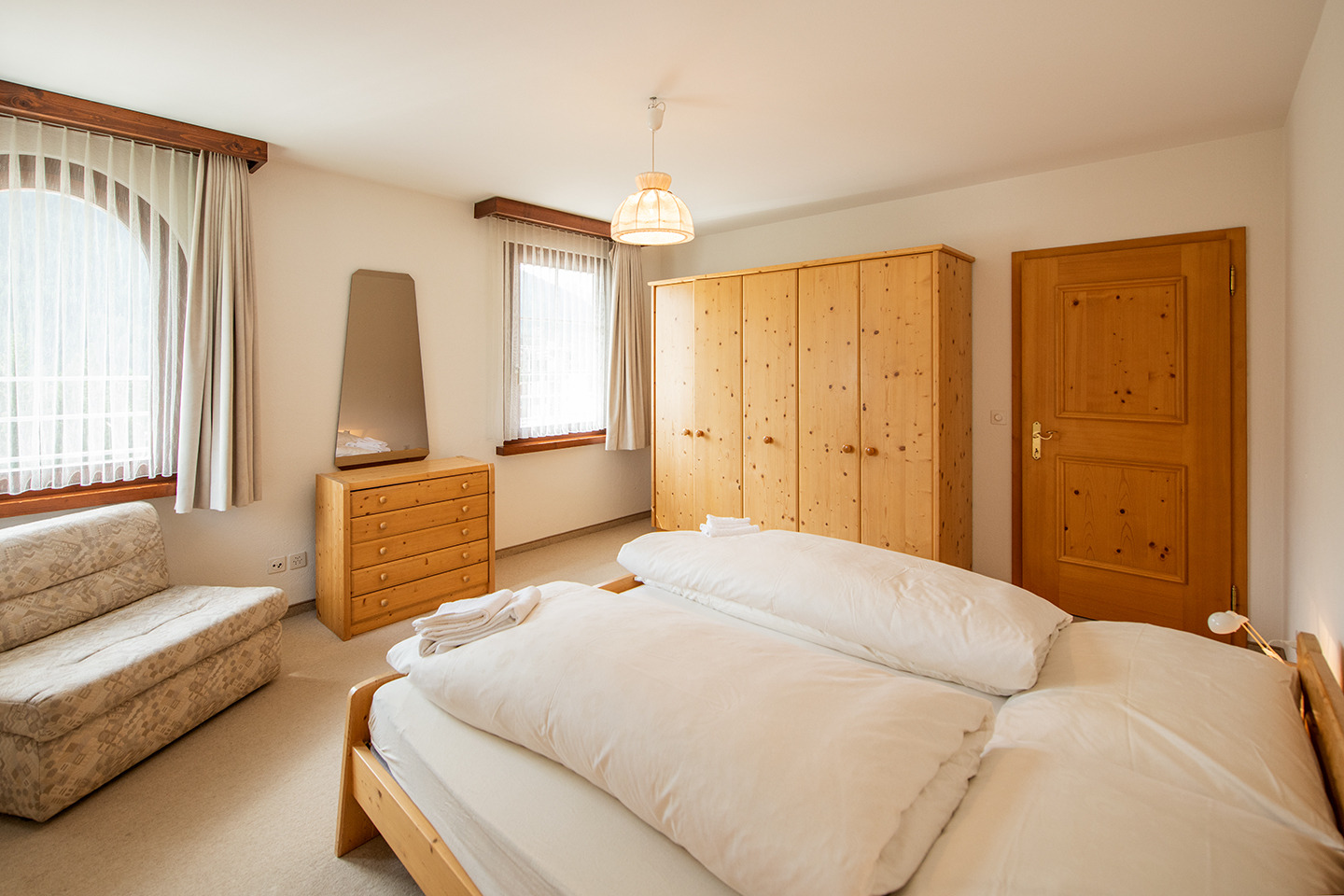 1 Schlafzimmer mit Doppelbett (2 Matratzen) und 1 Sofabett, Teppichboden.