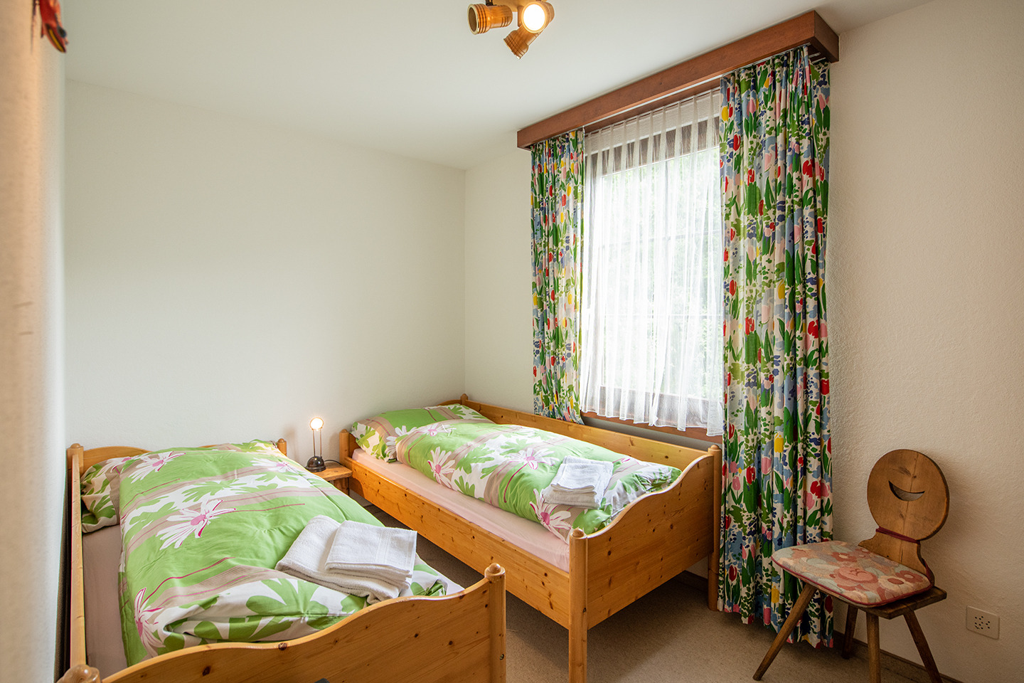 1 Schlafzimmer mit 2 Betten, Teppichboden.