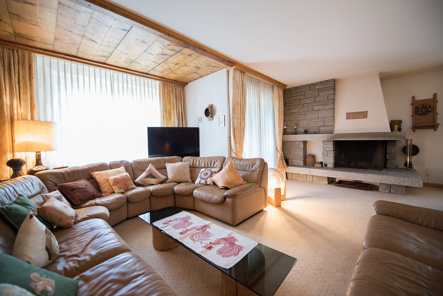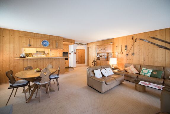 Wohnraum mit Polstergruppe, Essecke, TV, Wlan, Kamin.