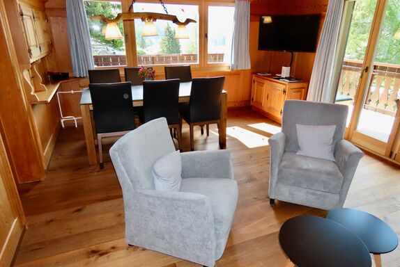 Wohnraum mit Esstisch (ausziehbar), Swisscom-TV, Wlan, Kamin.