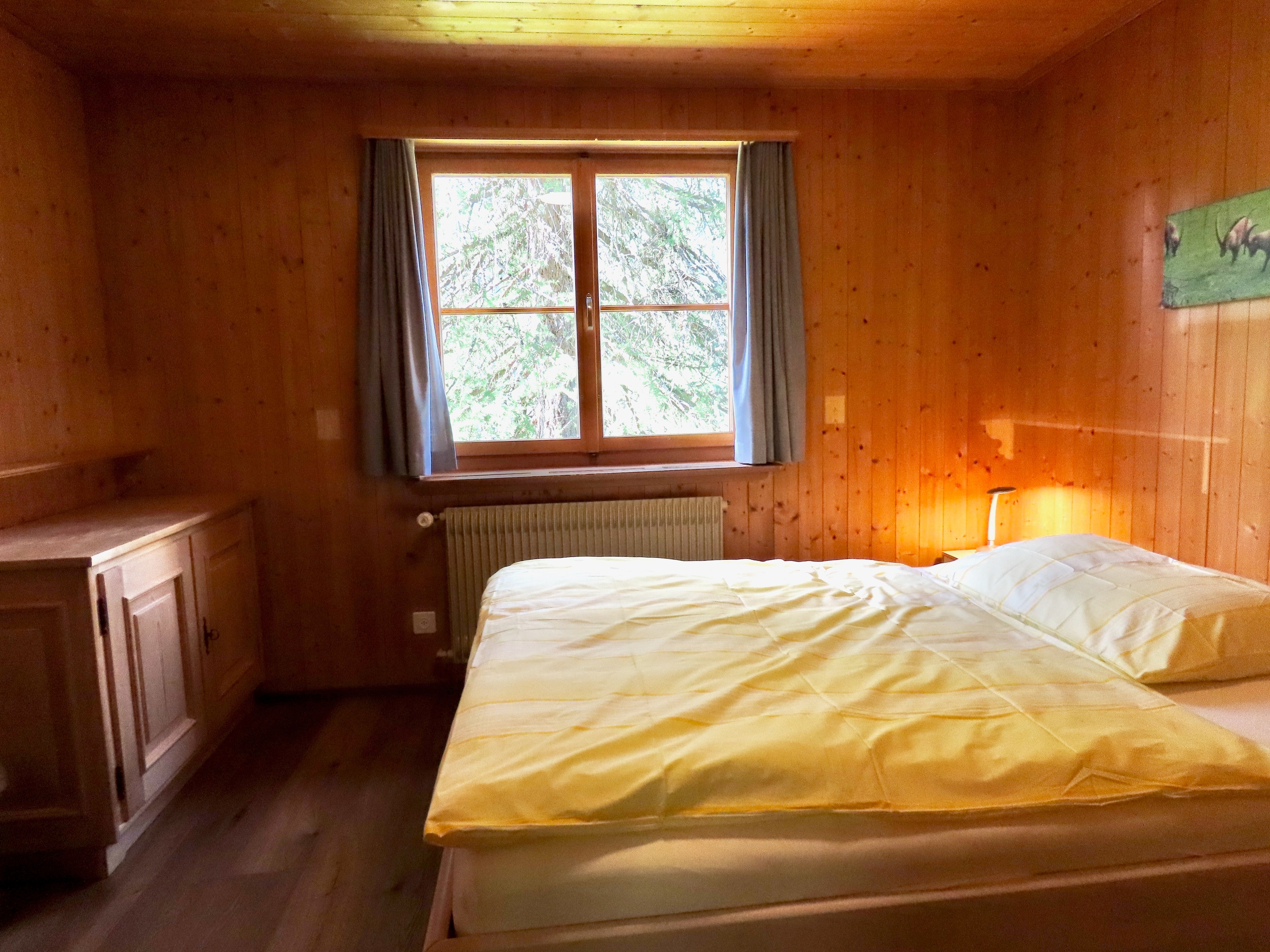 1 Schlafzimmer mit Doppelbett (2 Matratzen, 90x200) und Lavabo.