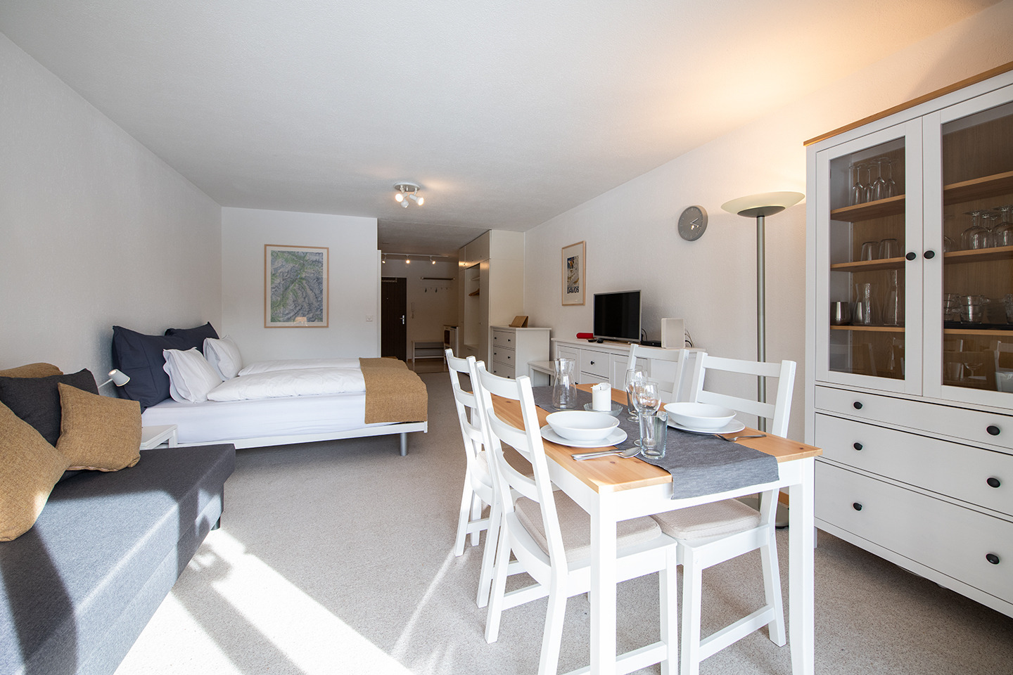 Wohnraum mit Polstergruppe, Essecke, 1 Doppelbett (2 Matratzen, 90x200), TV, W-LAN.
