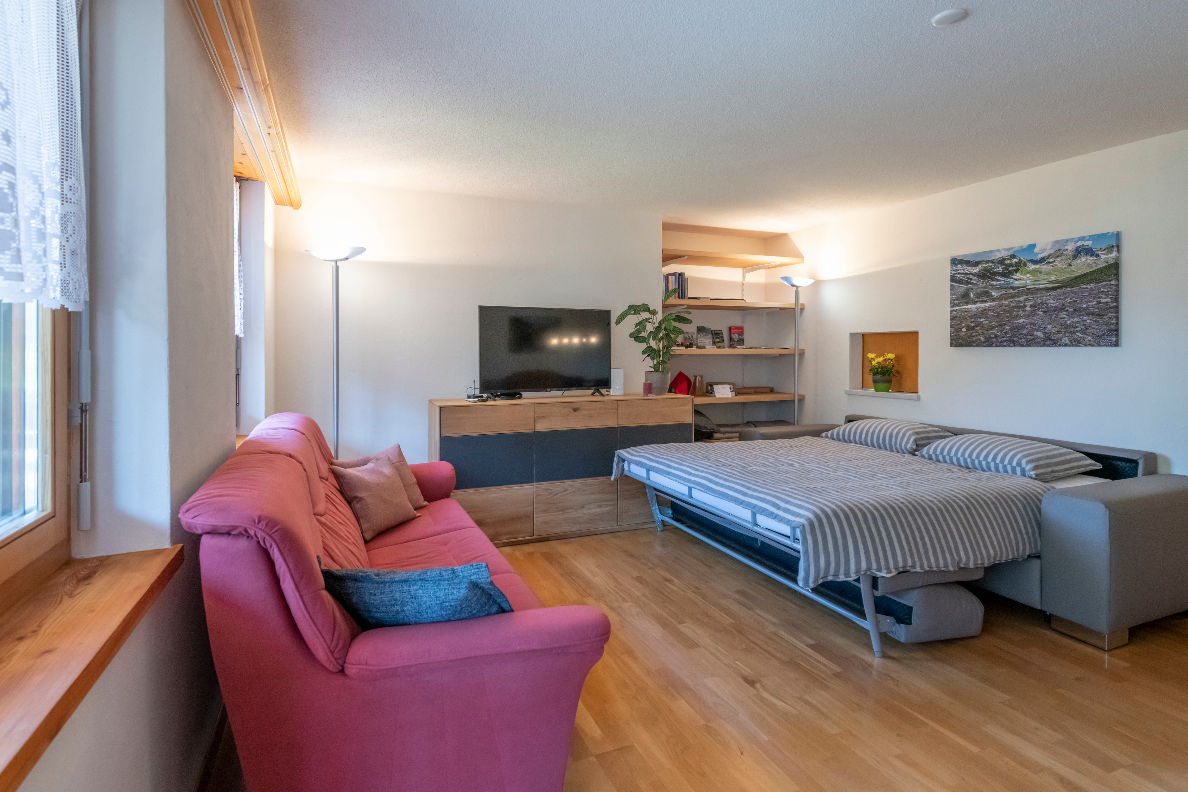 Wohnraum mit Polstergruppe, Sofabett (180x200), Essecke, TV, W-LAN.